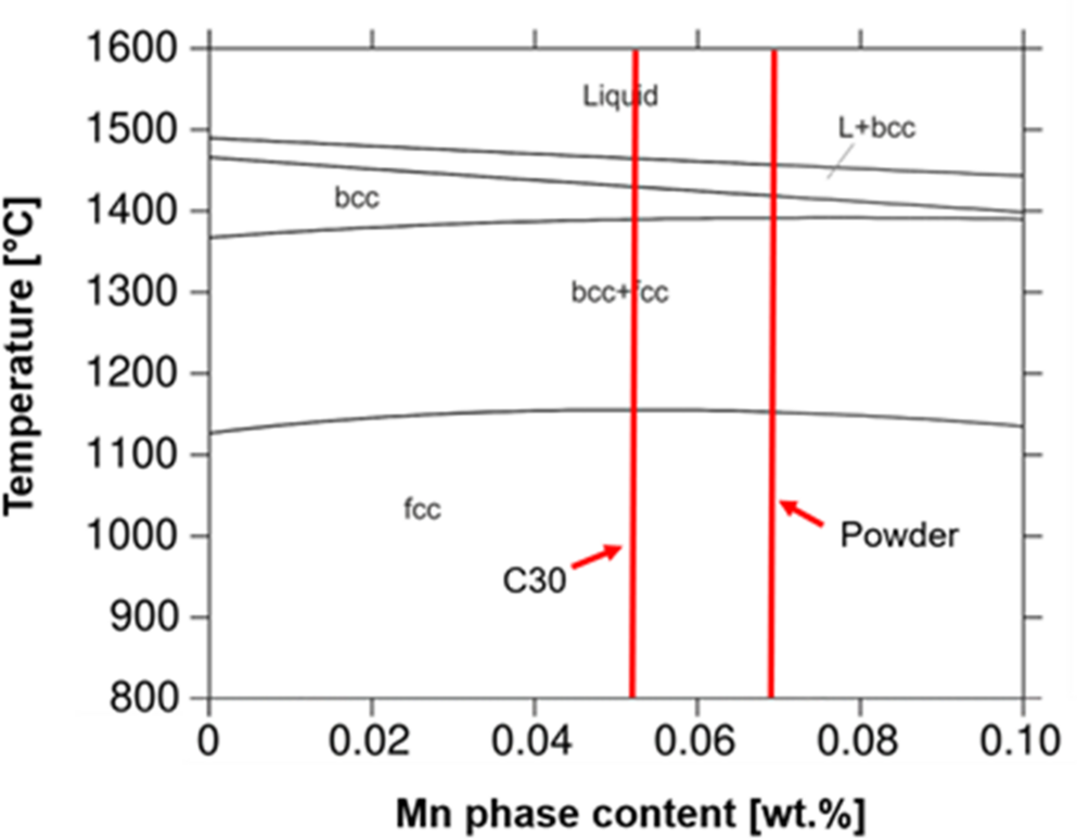 In contrast to C24, specimen C30 was manufactured with an increased energy input of \({E}_{\text{vol}}\) = 30 J/mm3 by using a lower scan speed of the beam. This causes a significant evaporation of manganese as shown by Günther et al. on steel X2CrMnNi16-6–6 [8, 9] and Burkhardt et al. in [19], as well as higher temperatures in the component. Burkhardt et al. [19] demonstrated that both factors have a significant impact on the resulting microstructure. Due to the lower scan speed, the electron beam remains a longer time in a certain area, resulting in reduced heat dissipation. Consequently, higher temperatures are achieved in the process. As described by Burkhardt et al. [19], the higher temperature within the component can inhibit the complete bcc → fcc solid phase transformation up to the building temperature, causing a part of the material to retain its ferritic structure. In addition, it is suggested in [19] that manganese evaporation might lead to an enlargement of the two-phase region bcc + fcc, thereby hindering the complete transformation from bcc to fcc during cooling down to build temperature. This also results presumably to a premature transformation from fcc to bcc upon reheating of the material during building of subsequent layers. Consequently, ferritic grains from previous build layers can grow epitaxially into the melt with primary ferritic solidification leading to columnar grain growth over multiple layers. According to the phase diagram shown in Fig. 16, it can be observed globally that a lower manganese content shifts the complete transformation to austenite to lower temperatures. However, manganese evaporation does not significantly alter the size of the two-phase field for the determined Mn content in the present case of specimens C24 and C30 (see Fig. 16). Therefore, it can be assumed that the increased energy input and finally the higher temperatures are the main reasons for columnar grain growth in cube C30.
