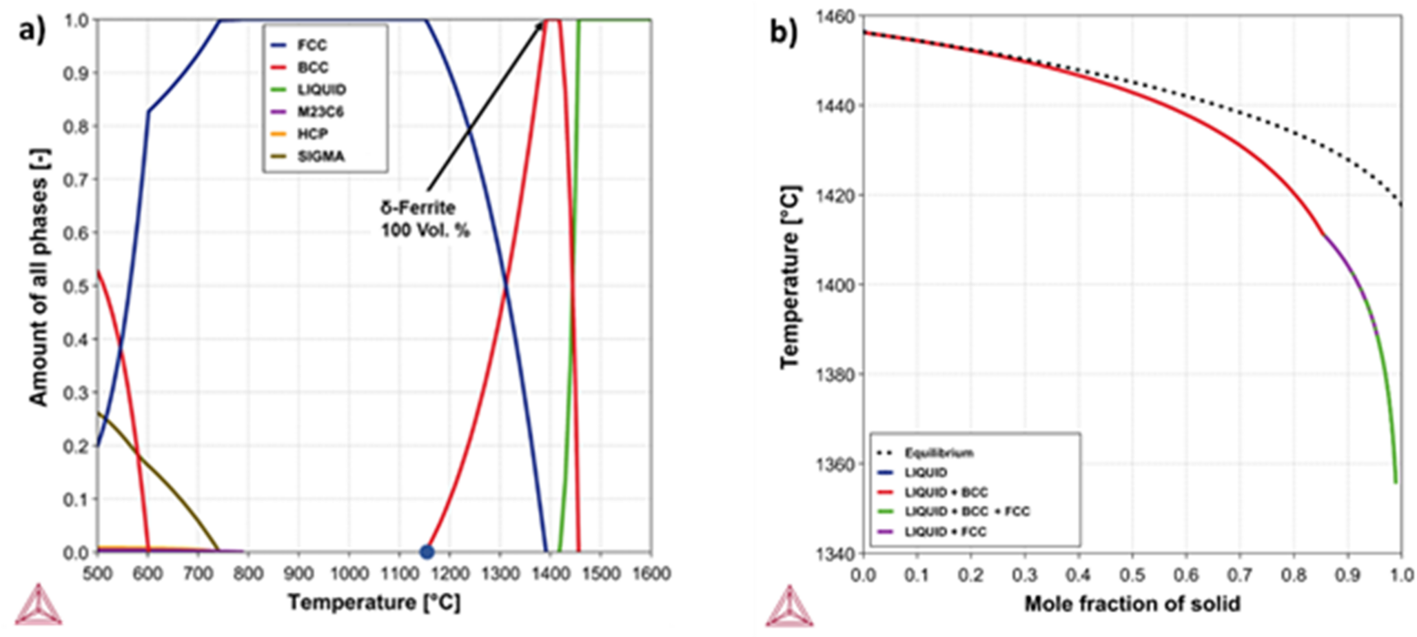 Thermodynamic calculation of the temperature-dependent phase evolution of steel X2CrMnNi16-7–4.5 using Thermo-Calc: (a) Under equilibrium condition; (b) Scheil-Gulliver solidification under equilibrium (dotted line) and non-equilibrium conditions (solid line)