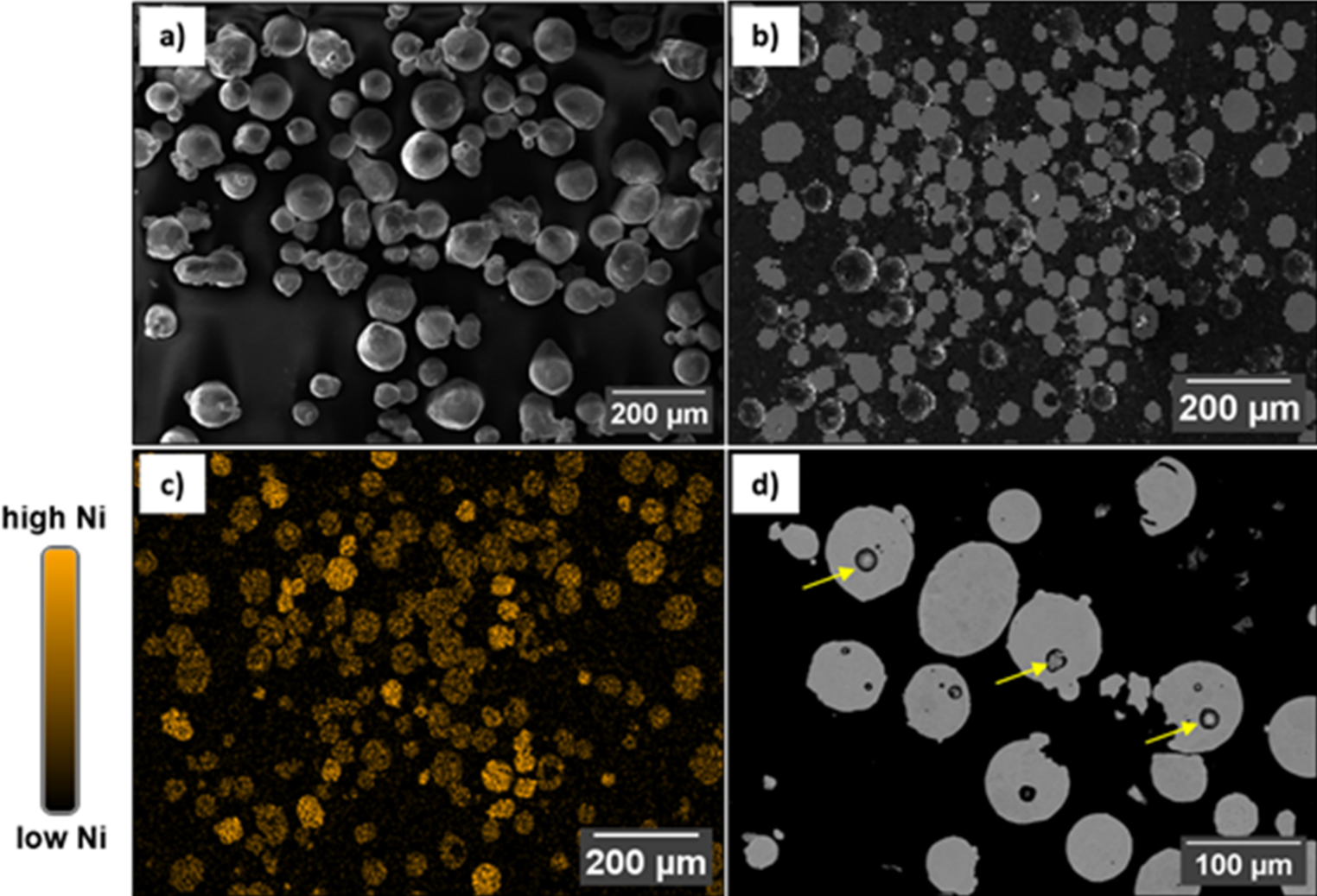 SEM images of the mixed steel powder X2CrMnNi 16–7-4.5 in SE contrast: (a) Morphological structure of the powder particles; (b) Powder particles after metallographic preparation and (c) corresponding EDS elemental mapping for nickel. (d) Metallographic cross section of the powder mixture at higher magnification