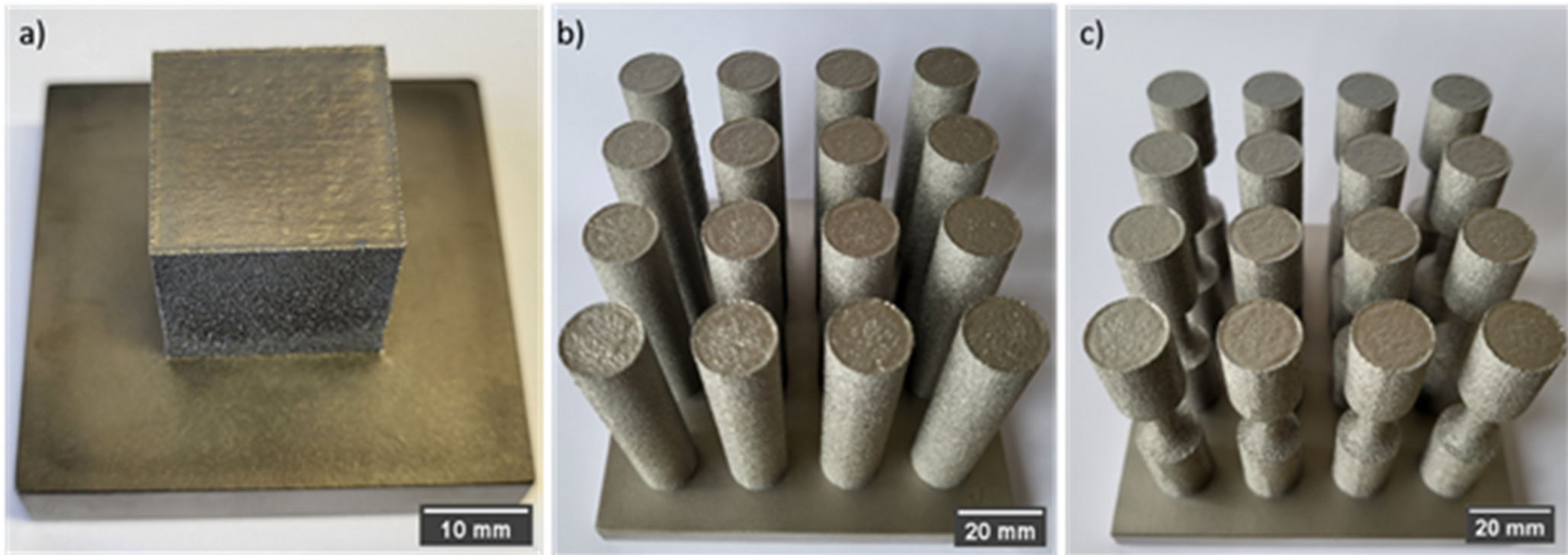 Photographic images of specimens made of steel X2CrMnNi 16–7-4.5: (a) Cube C24 for microstructure investigation and preparation of tensile specimens. (b) Cylindrical rods for machined fatigue specimens (batch F24). (c) Net-shape fatigue specimens for as-built fatigue testing (FN30)