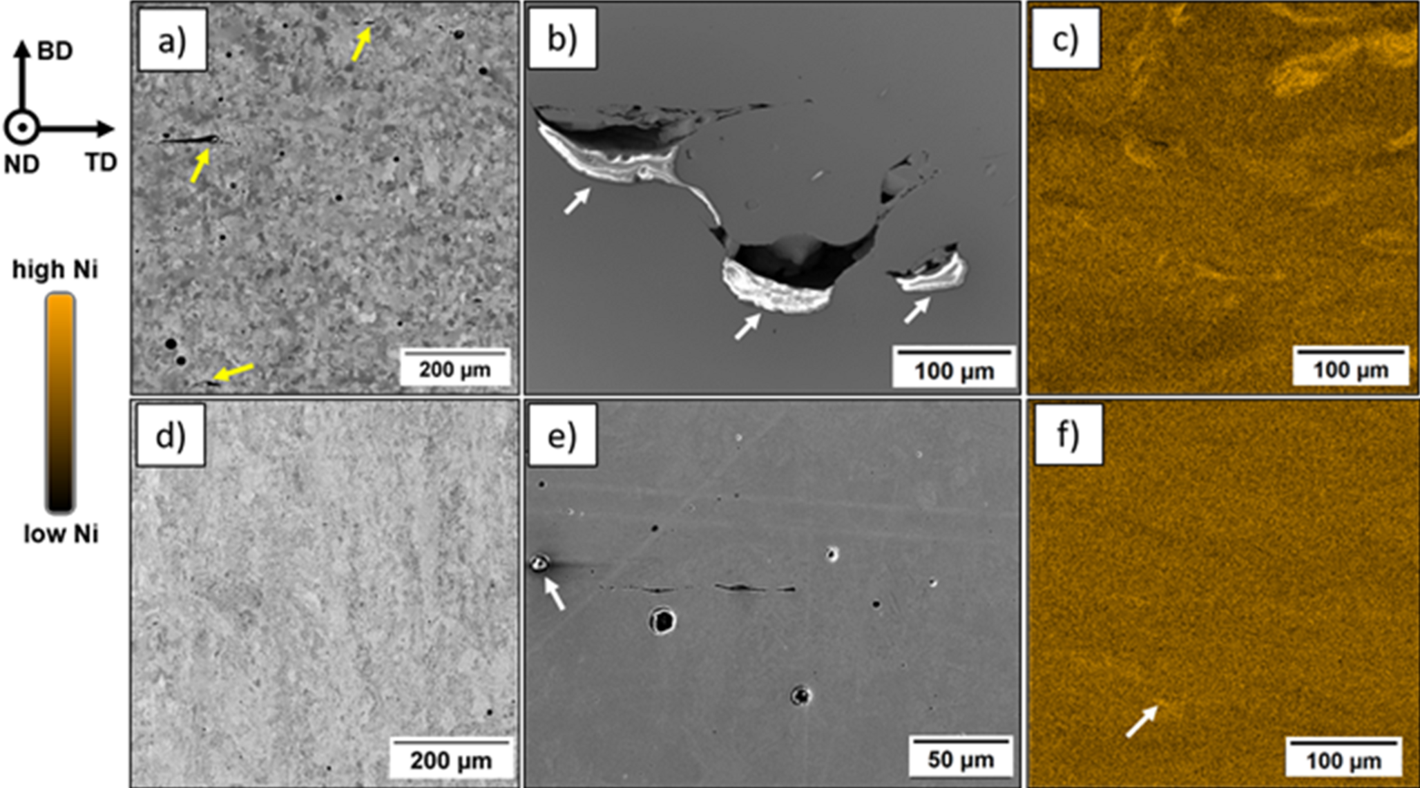Examination of the freshly mixed and sieved powder using SEM showed reasonably spherical particles containing a small number of satellites as shown in Fig. 2a. In Fig. 2b,c a representative metallographic cross-section of the mixed powder and the associated EDS area scan are presented, showing the nickel content for individual particles. It is clearly evident that the particles of the steel with 3 wt.% Ni predominate, while significantly fewer particles of the powder with 9 wt.% Ni are present. At higher magnifications, the particles revealed a relatively high amount of porosity in the individual powder particles of both powders (indicated by arrows in Fig. 2d).