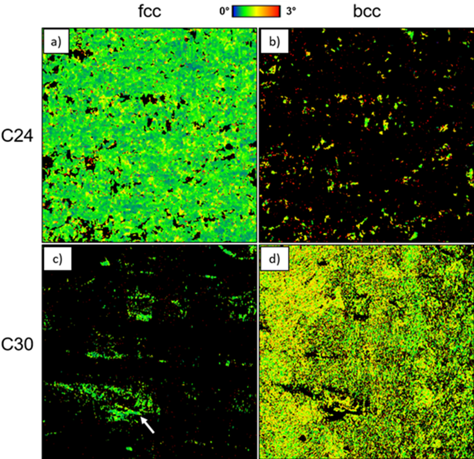 In addition, KAM analyses were performed to investigate potential differences in the average misorientation between fine-grained microstructures and columnar grains. No significant differences were observed within the \(fcc\) phase between the two specimens C24 (0.8°) and C30 (0.9°). Similarly, the \(bcc\) phases of both specimens showed comparable misorientation values (1.4° and 1.5°, respectively). However, the overall misorientation within the \(bcc\) phase was notably higher than in the \(fcc\) phase, which can be attributed to lattice distortions caused by the martensitic phase transformation occurring during specimen preparation.
