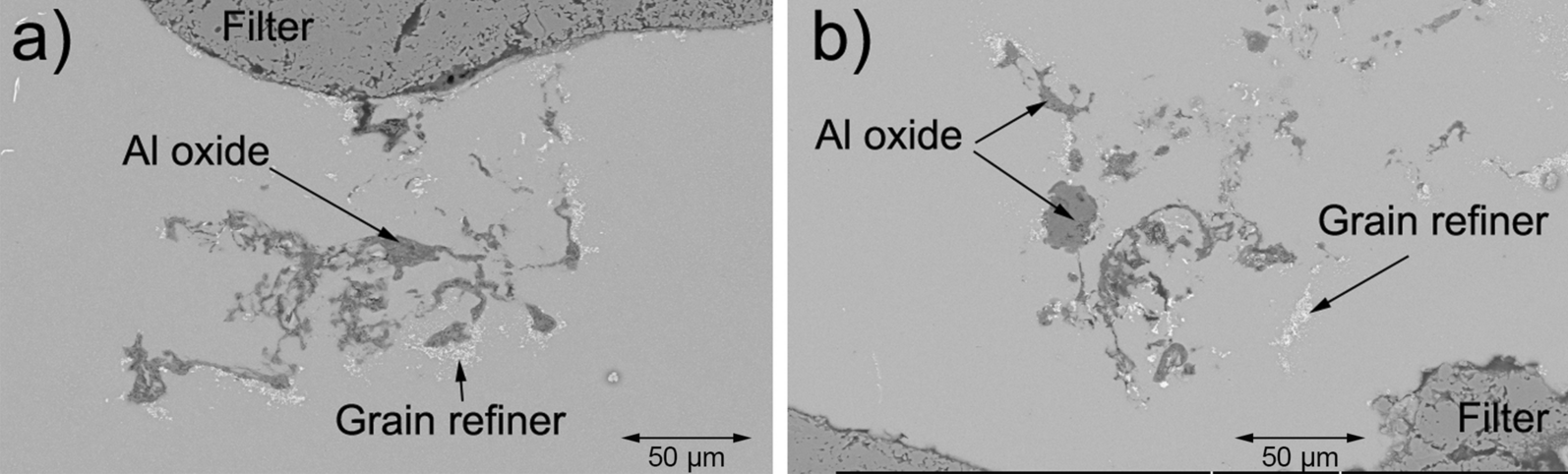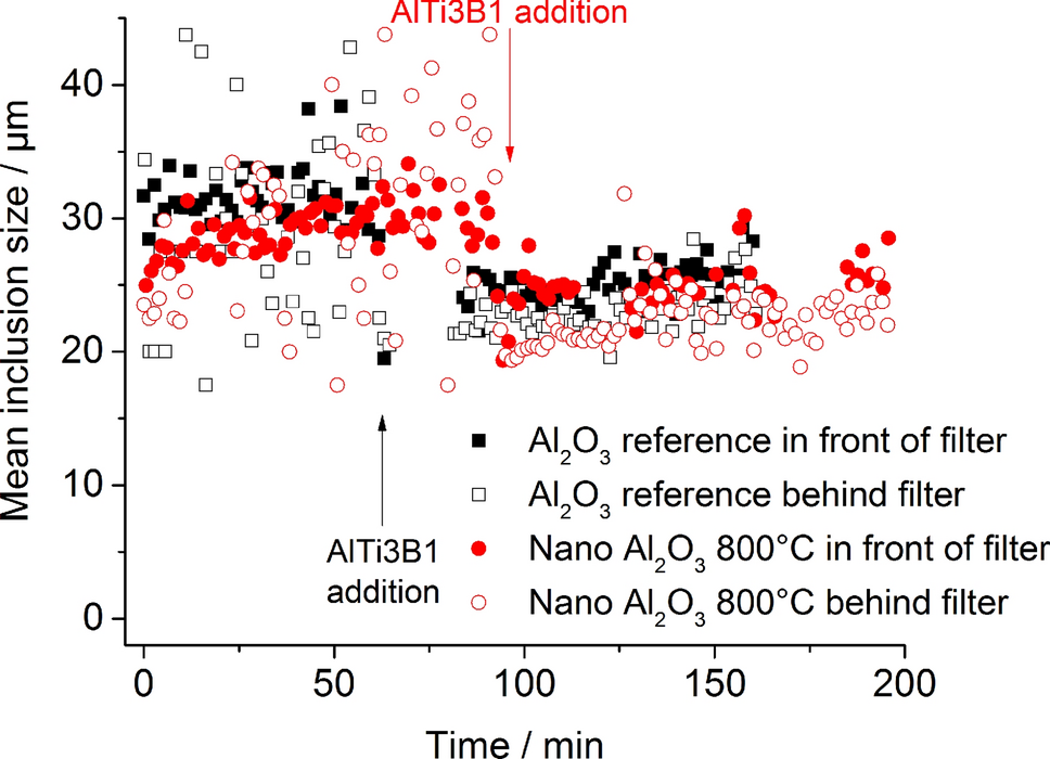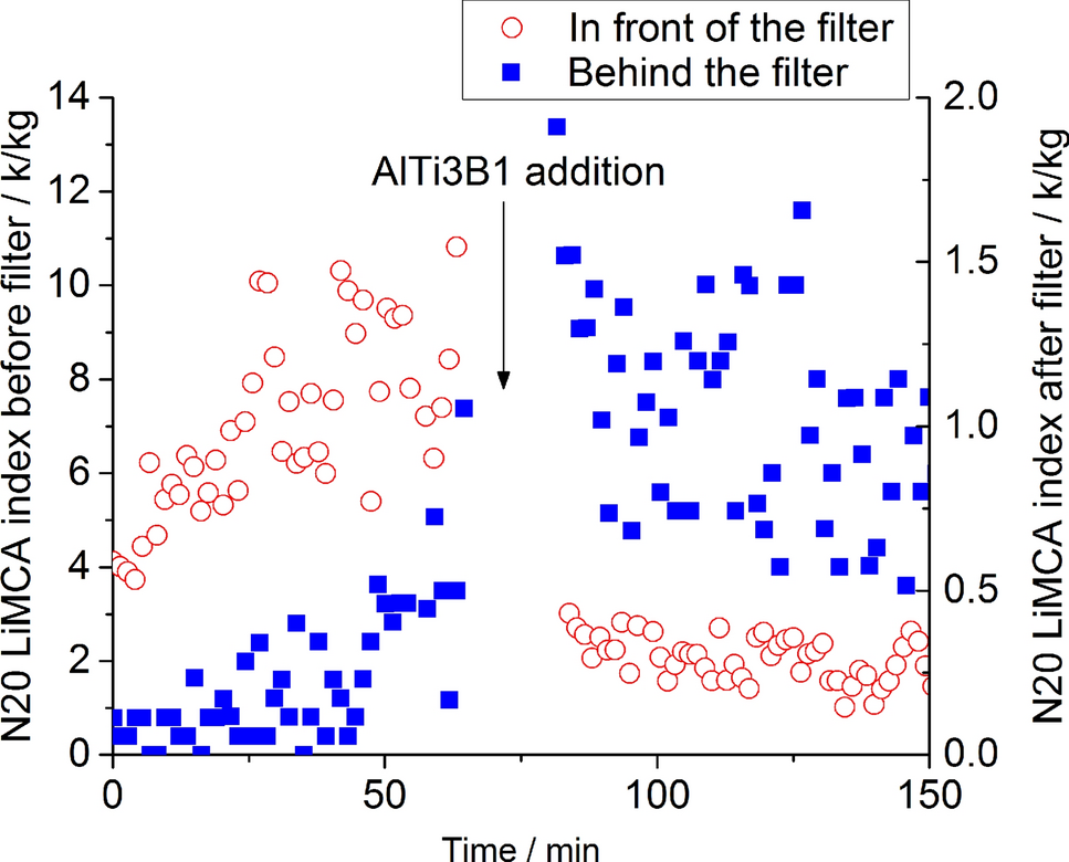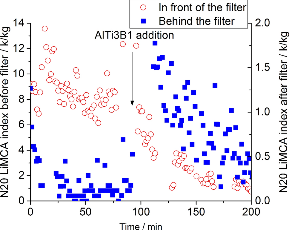The addition of AlTi3B1 grain refiner reduced the filtration efficiency by approximately half, whereby the AlTi3B1 decreased the N20 in front of the filter and increased the N20 level behind the filter. Furthermore, the mean inclusion size decreased after addition of the AlTi3B1 grain refiner from approx. 31 µm to approx. 25 µm.