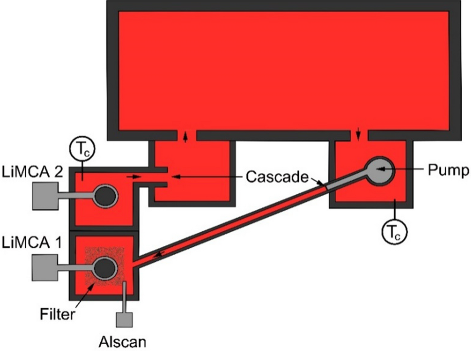 The system was equipped with K-type thermocouples at the filter bowl, the main chamber and the pump chamber, an Alscan unit (AlSCAN 3, ABB Ltd., Canada), and two LiMCA II units (ABB Ltd., Canada), which facilitated continuous monitoring of both inclusion number and size in front of and behind the filter.