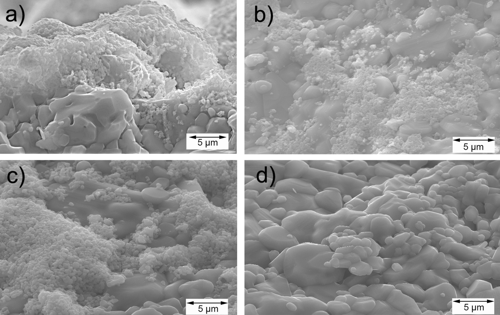 SEM images of the nanocoated filters with (a) nanosheets; (b) nanopowder sintered at 800 °C; (c) nanopowder sintered at 1250 °C; and (d) nanopowder sintered at 1600 °C