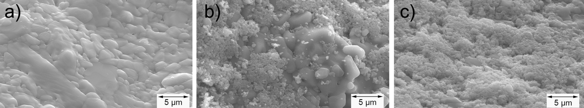 At higher magnifications than the × 3000 used for the SEM images in Figure 4, elongated, thin structures induced by the nanosheets used were visible. However, a magnification of × 3000 was chosen to facilitate better comparability between the different filter types. After the moderate impingement test, these super-fine features disappeared and only the typical Al2O3 surface was visible with grains sizes ranging from approximately 2 to 10 µm (see Figure 5(a))). There were two possible explanations for this observation. One was that the nanosheet coating was washed off the filters by the aluminum melt due to insufficient bonding of the coating, while the other was that the nanosheets were dissolved at 740 °C in the aluminum melt due to their reactivity. In summary, the nanosheet coating was not stable during the aluminum filtration process and, consequently, no further experiments with nanosheets were performed within the framework of this study.