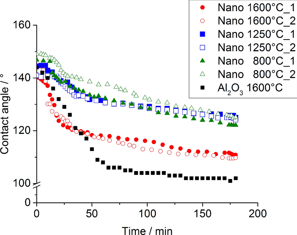 In this work, the contact angle between the aluminum melt and the substrates with and without nanofunctionalization was determined by means of the sessile drop technique. Afterwards, alumina filters with and without nanofunctionalized surfaces were tested in short-term and long-term aluminum filtration trials to determine their filtration behavior.