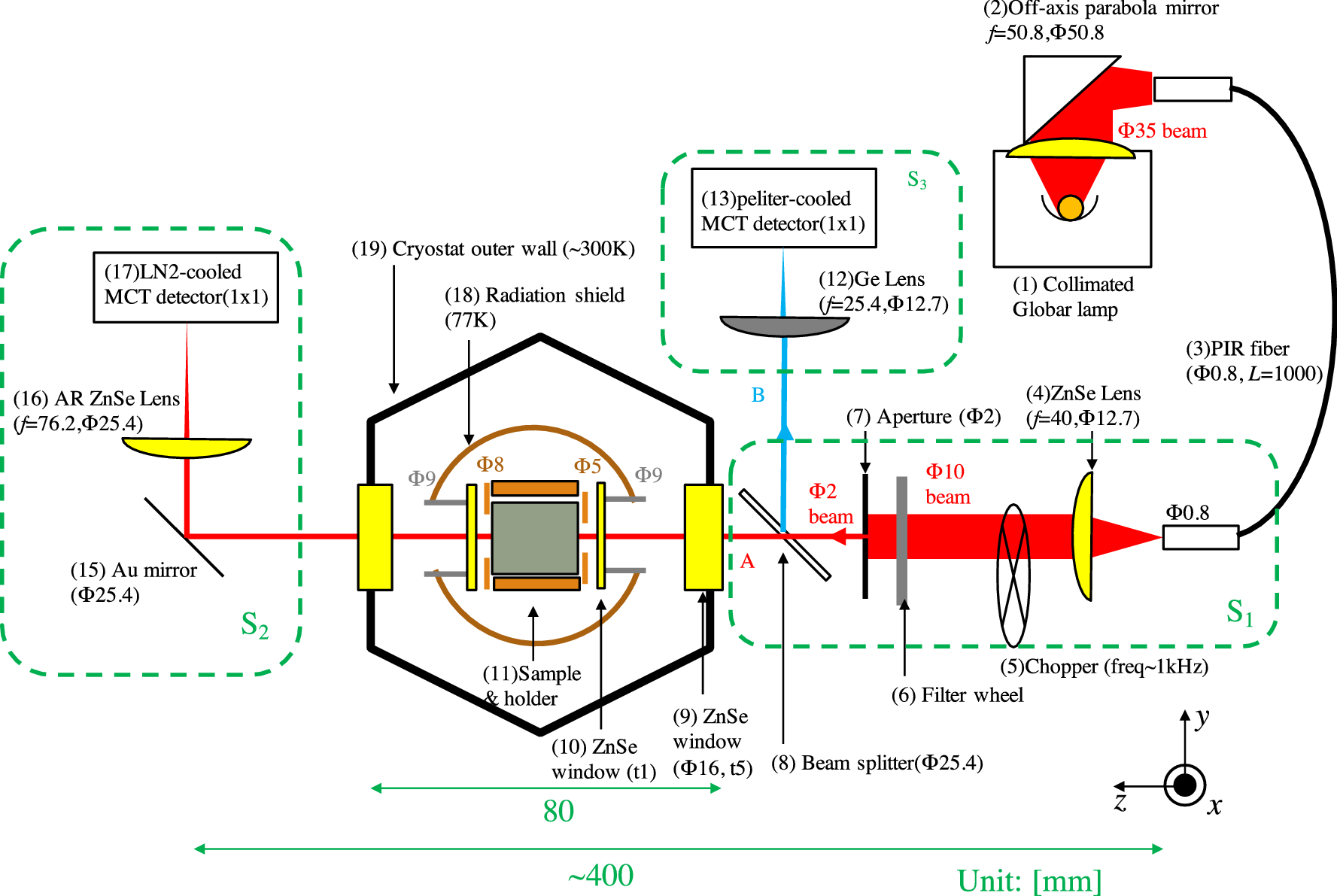 The measurement system. Each component is described in the text. Red and blue lines show the beam path. Dimensions are in millimeters. Focal length f is indicated for each lens. Thickness, diameter, length of each component are denoted by t, \(\Phi \), and L, respectively. Components in green dashed areas are mounted on each stage plate. The stages \(S_1\), \(S_2\)\(S_3\) can move in two directions vertical to the beam axis. The temperatures of the cryostat outer wall (19) and the radiation shield (18) are \(\sim 300\) K and \(\sim 77\) K, respectively, when a sample is cooled to the lowest temperature (8.6 K). Details of sample holder structure are described in Appendix B (Color figure online).