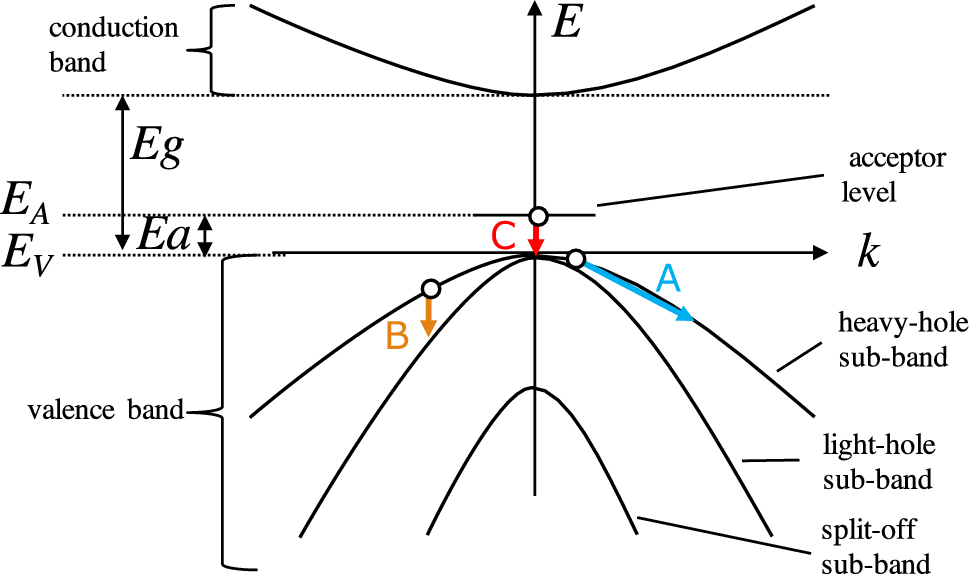 To discuss the dominant absorption cause, we built a model of the \(\alpha \) of CdZnTe. To discuss the causes at room temperature, we included the absorption causes considered in the CdZnTe study at room temperature5 in our model. Figure 3 shows a schematic view of the band structure of p-type CdZnTe and hole transitions related to absorption in the model. At room temperature, p-type CdZnTe absorbs due to two types of free-carrier transition: (A) transitions within the same valence sub-band, (B) transitions from the heavy-hole sub-band to the light-hole sub-band, as in e.g.17 According to the room-temperature study, CdZnTe has attenuation due to Te precipitates and the lattice absorption.5