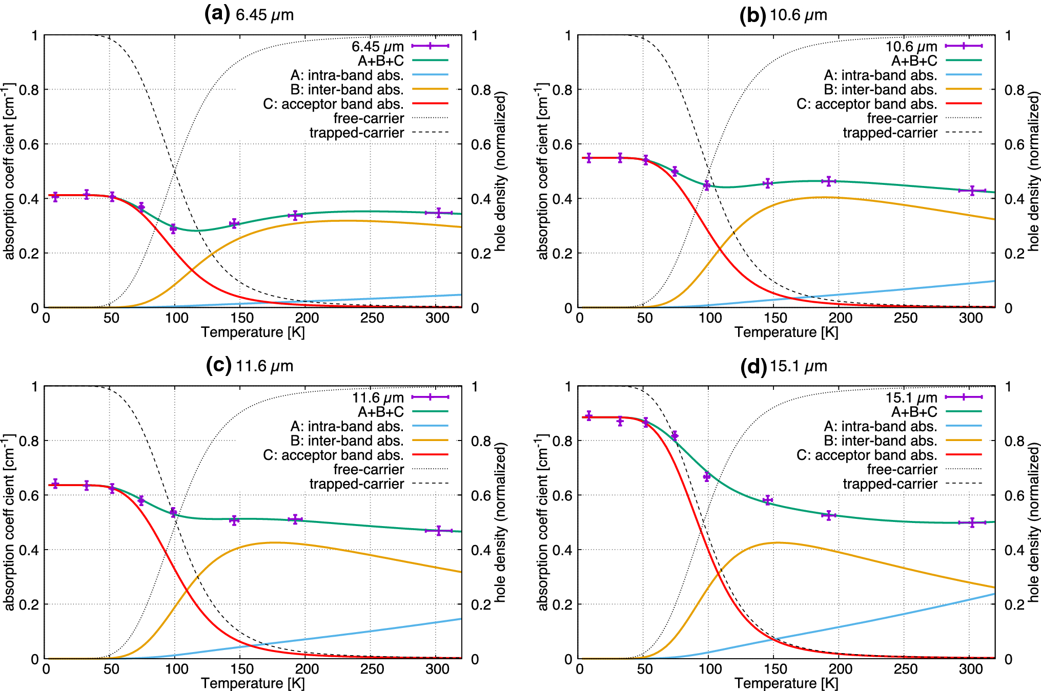 The temperature dependence of the absorption coefficient of the CdZnTe in the \(\lambda =\)a 6.45, b 10.6, c 11.6, and d 15.1 \(\mu \)m bands and the fitted model. The purple points show the measured \(\alpha \). The error bars show 1\(\sigma \) uncertainty ranges. Green solid lines show the total fitted absorption model. Sky-blue dashed, orange dotted, and red dashed-dotted lines show the fitted models of intraband, interband, and acceptor band absorption, respectively. The black dotted and dashed lines show the normalized density of free holes and trapped holes, respectively, by the right scale of the vertical axis (Color figure online).