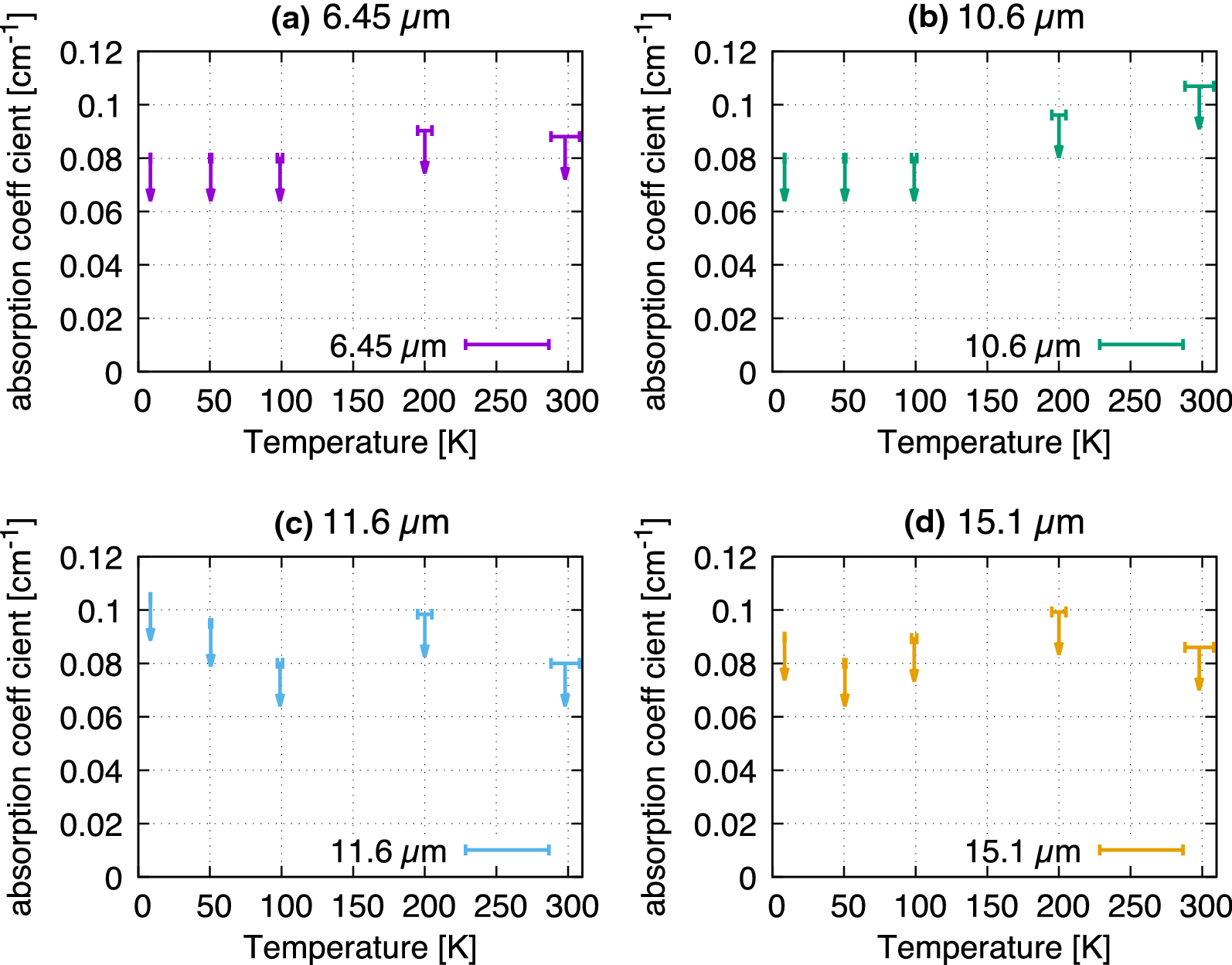 Absorption coefficient of CdZnTe at a wavelength of \(\lambda =6.45\) (purple), 10.6 (green), 11.6 (sky blue), and 15.1 (orange) \(\mu \)m. Vertical error bars show the 1\(\sigma \) uncertainty range of the absorption coefficient. Horizontal error bars show the accuracy of the temperature (Color figure online).
