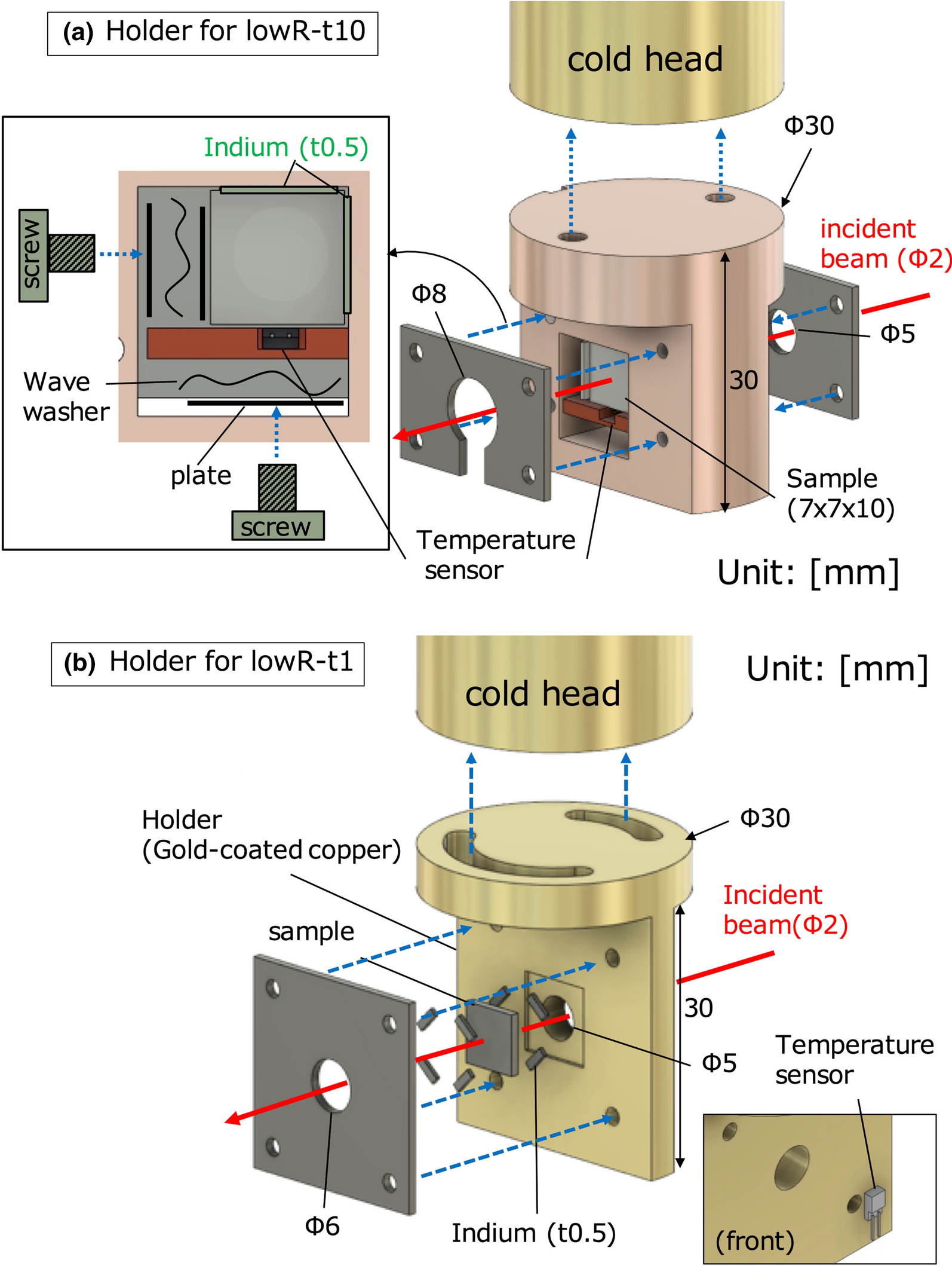Two types of sample holder: a holder for the lowR-t10 sample and b holder for the lowR-t1 sample. Holders are screwed to the cold head of the cryostat. Red arrows show the beam path. Blue dashed arrows indicate screwed-in points. Dimensions are in millimeters. Details are described in the text (Color figure online).