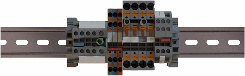 Terminal strips consist of several terminal blocks mounted next to each other on a DIN rail.