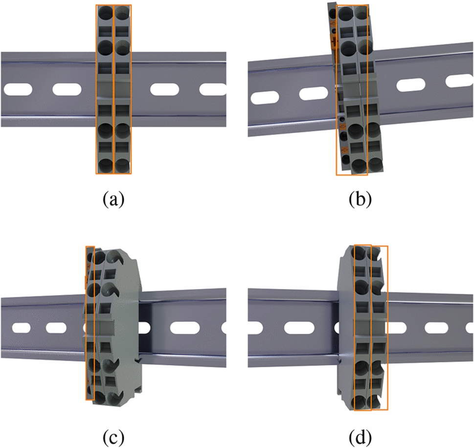 While scenario (a) shows an unproblematic case of a well-centered front view of two terminal blocks, image (b) demonstrates that a slight camera rotation of \(5^{\circ }\) around the viewing direction already widens the bounding boxes, such that they include half of the neighboring terminal blocks. Moreover, scenarios (c) and (d) illustrate that components can occlude each other, and terminal blocks with a roof-like shape are hard to annotate, depending on the camera position.