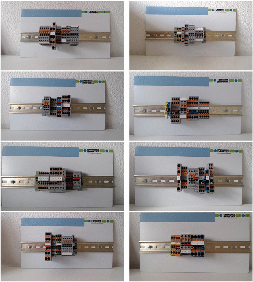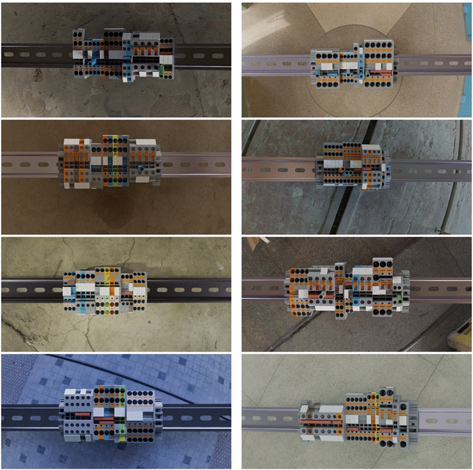 In this paper, we consider 36 terminal blocks, including two connection technologies, three wire sizes, and two to four connection points to cover almost identical and easily distinguishable objects. Furthermore, the terminal blocks are randomly equipped with plug-in bridges, test adapters, markings, and end covers, and different realistic textures are used. Therefore, we manually created virtual materials by adapting roughness, specular, metallic, and RGB values in Blender until the renderings looked similar to real reference images.