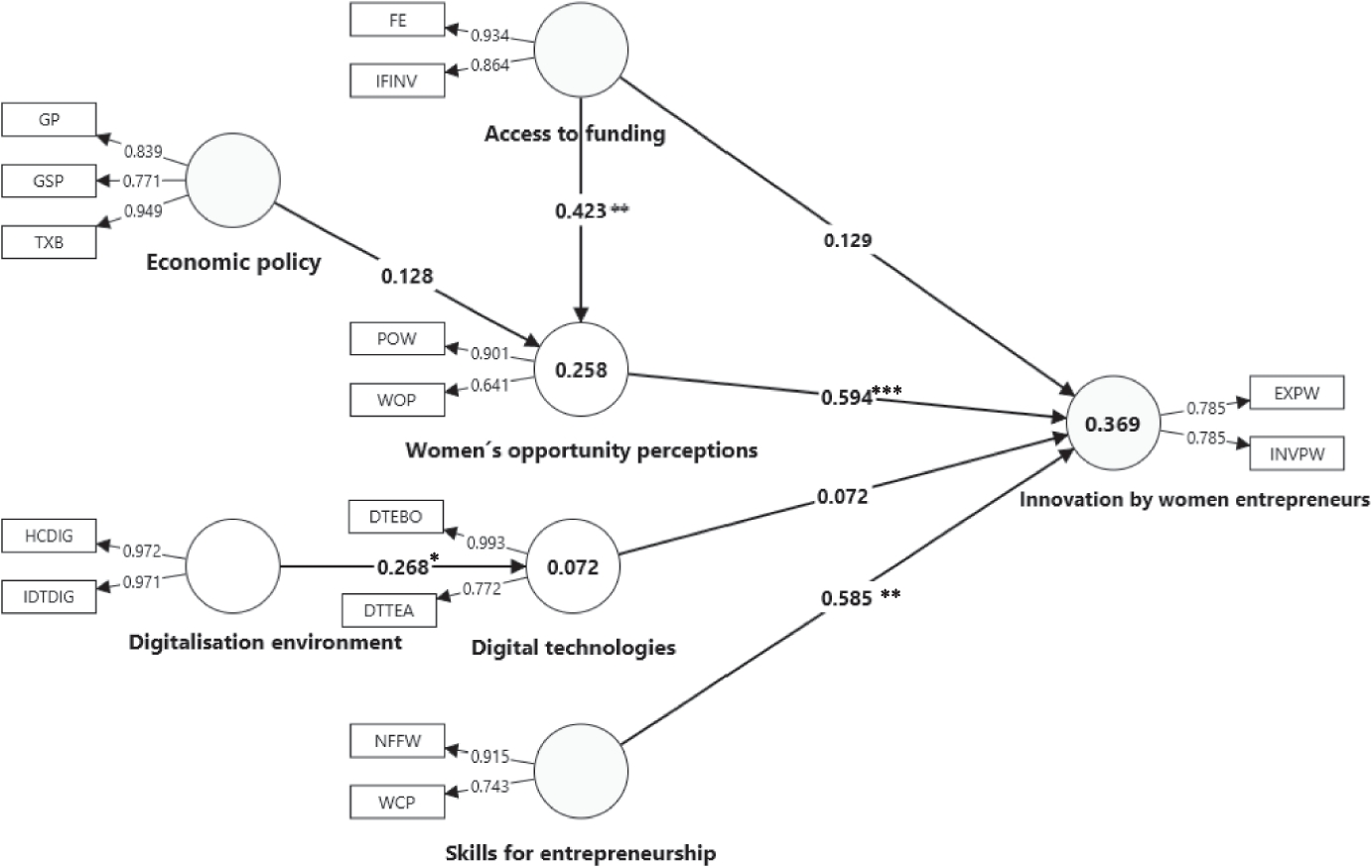 Purpose/research questions: The objective of this research is to investigate the innovation and internationalisation of female entrepreneurship by identifying a set of relevant latent variables, including opportunity perceptions, digitalisation, human capital and skills for entrepreneurship, public policies, and access to sources of financing. We use data obtained from 13 European countries (concerning the period from 2020 to 2022) and the partial least squares (PLS) method to evaluate the complex relationships among the latent variables and answer the following questions: