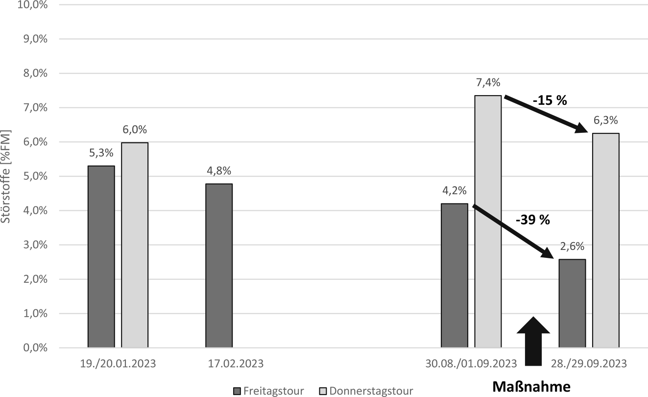 In Abb. 10 ist zu erkennen, dass der Störstoffgehalt der Donnerstagtour innerhalb von drei Wochen von 4,2 % auf 2,6 % FM sank, was einer Reduktion von 39 % entspricht.