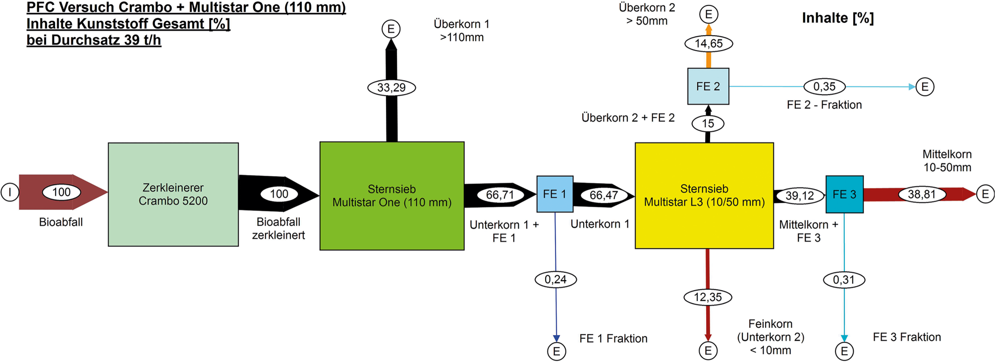 Auf Basis der Störstoffbilanz konnten Störstoffinhalte ermittelt werden. Die Anreicherung der Störstoffe erfolgte in den Fraktionen Überkorn 1 und Überkorn 2. Die Fraktionen Mittelkorn und Feinkorn stellten demnach die von Störstoffen weitestmöglich entfrachteten Produktströme dar. Der Großteil der im Aufgabestrom enthaltenen 6,24 % Störstoffe (Masseprozent in Bezug auf Feuchtemasse) waren Kunststoffe mit 5,31 %. Der gesamte Kunststoffgehalt wurde bereits nach der ersten Siebstufe von 5,31 % auf 1,37 % reduziert. Dabei erfolgt eine Anreicherung der Kunststoffe von 13,21 % im Überkorn nach der ersten Siebstufe. Eine detaillierte Kunststoffbilanz ist in Abb. 15 ersichtlich, die Angaben in der Grafik beziehen sich auf die Gehalte im jeweiligen Outputstrom.