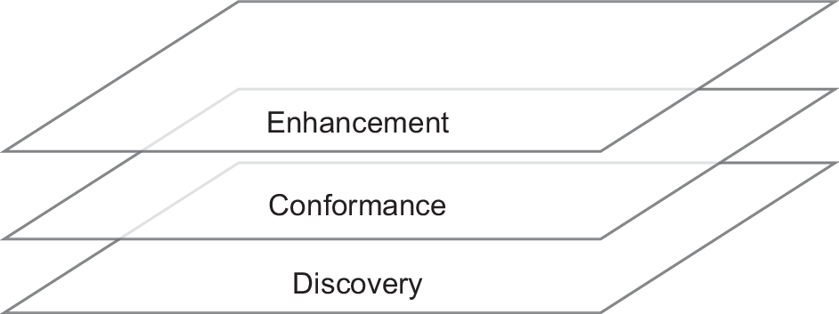 Die Forschung stellt einen umfassenden Werkzeugkasten von Techniken und Verfahren bereit, die im Process-Mining-Kontext eingesetzt werden können. Die Verfahren können drei grundlegenden Teilbereichen zugeordnet werden: Prozesserkennung (Discovery), Konformitätsprüfung (Conformance) und Prozessverbesserung (Enhancement) [7]. Die drei Bereiche werden im Folgenden näher betrachtet, um eine Übersicht der Arbeitsweise und der Erfolgsmöglichkeiten des Process Mining zu erlangen (Abb. 1).