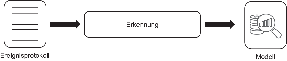 Der erste Bereich im Process Mining umfasst die Prozesserkennung. Das Ziel der Prozesserkennung besteht in der Erzeugung eines Prozessmodells, welches den zugrunde liegenden Prozess repräsentiert. Das Prozessmodell wird aus dem Ereignislog des Informationssystems abgeleitet und es werden keine zusätzlichen A‑priori Informationen in das Prozessmodell aufgenommen. Dadurch wird ein objektiver Einblick in die Prozessstruktur ermöglicht [8]. Der Vorgang im Rahmen der Prozesserkennung ist in Abb. 2 illustriert. Wie der Abbildung entnommen werden kann, wird als Eingabe für die Verfahren lediglich das Ereignislog benötigt. Die Ausgabe ist dann das tatsächliche Prozessmodell.