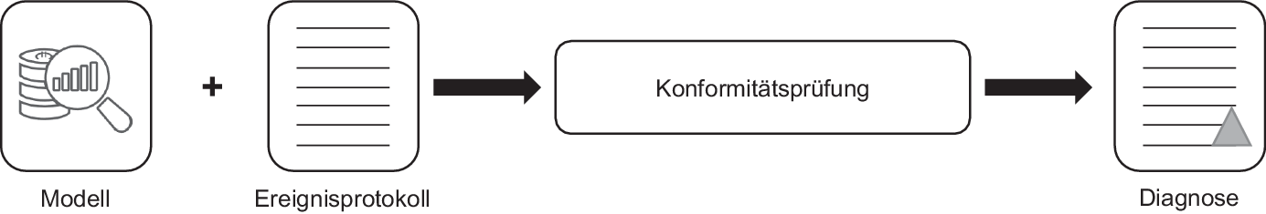 Das Prinzip der Konformitätsprüfung ist in Abb. 3 illustriert. Als Eingabe für die Verfahren dieser Gruppe dienen das Modell sowie das Ereignislog. Das Modell hat deskriptiven Charakter und beschreibt, was im Prozessablauf passieren soll. Das Ereignislog dagegen hat normativen Charakter und beschreibt, was tatsächlich passiert. Die Ausgabe der Konformitätsprüfung sind Diskrepanzen zwischen dem gewünschten und dem tatsächlichen Prozessablauf in Form einer Diagnose [1].