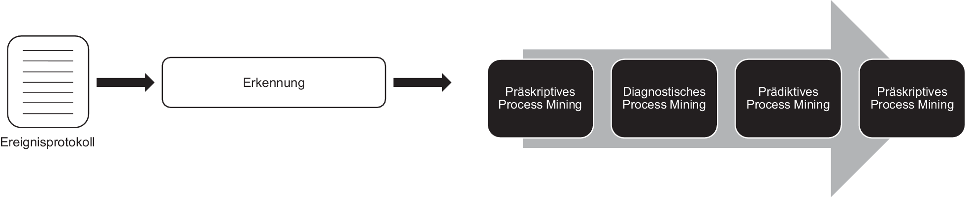 Die Verfahren des intelligenten Process Mining werden in unterschiedlichen Bereichen eingesetzt. Diese Bereiche bauen aufeinander auf und sind übersichtlich in Abb. 5 veranschaulicht. Zunächst ermöglichen die auf KI basierten Verfahren des präskriptiven Process Mining eine Nutzbarmachung von zusätzlichen Daten, wodurch die Datenbasis und infolgedessen auch die Qualität der Analyseergebnisse gesteigert werden kann. Weiterhin können die auf KI basierten Verfahren des diagnostischen Process Mining Probleme identifizieren, die aufgrund ihrer Komplexität beim klassischen Process Mining nicht erkannt werden können. Darauf aufbauend können die im Rahmen des prädiktiven Process Mining eingesetzten Anwendungen der KI Vorhersagen über den Ausgang der Prozessabläufe liefern. Dadurch kann ein fehlerhafter Prozessablauf bereits vor dem Auftreten von Problemen in Echtzeit korrigiert werden. Zuletzt können die auf KI basierten Verfahren des präskriptiven Process Mining nicht nur Handlungsempfehlungen für einen optimierten Prozessablauf abgeben, sondern diese auch selbst in den Systemen des Unternehmens implementieren.