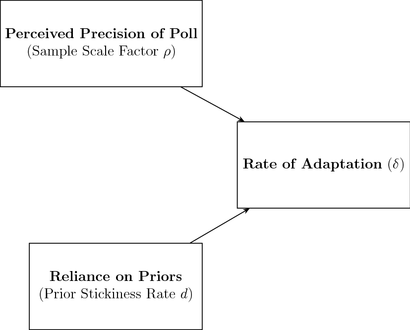 In our Bayesian learning model the rate of adaptation depends on two aspects: (a) the perceived precision of the poll and (b) the stickiness of prior beliefs. Figure 1 shows the conceptualization that the two influence the overall adaptation rate.