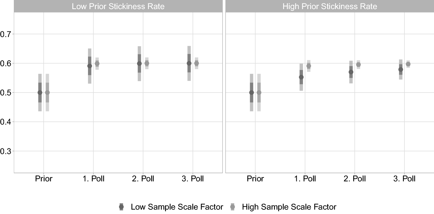 The illustration highlights that the voter with a low prior stickiness rate, who does not rely heavily on prior beliefs, and high sample scale factor directly updates her expectation to the polls result. This is also true for the voter with a low prior stickiness rate and a low sample scale factor but the uncertainty is larger. In the case of a high prior stickiness rate, we again see that a voter with a high sample scale factor almost immediately updates the expectation. Only in the case with a high prior stickiness rate and a low sample scale factor after three polls we still see difference in the expectation and persistence of the prior beliefs. The voter here can be described as someone who judges the information from the polls to be imprecise and who puts a strong emphasis on the priors. One takeaway from this illustration is the importance of the interplay between the prior stickiness rate and precision in explaining reluctant or cautious learning. Only the combination of strong reliance on priors and and low subjective precision of the poll leads to very slow learning about the expected support. A low sample scale factor only persists in the uncertainty around the expectation.8