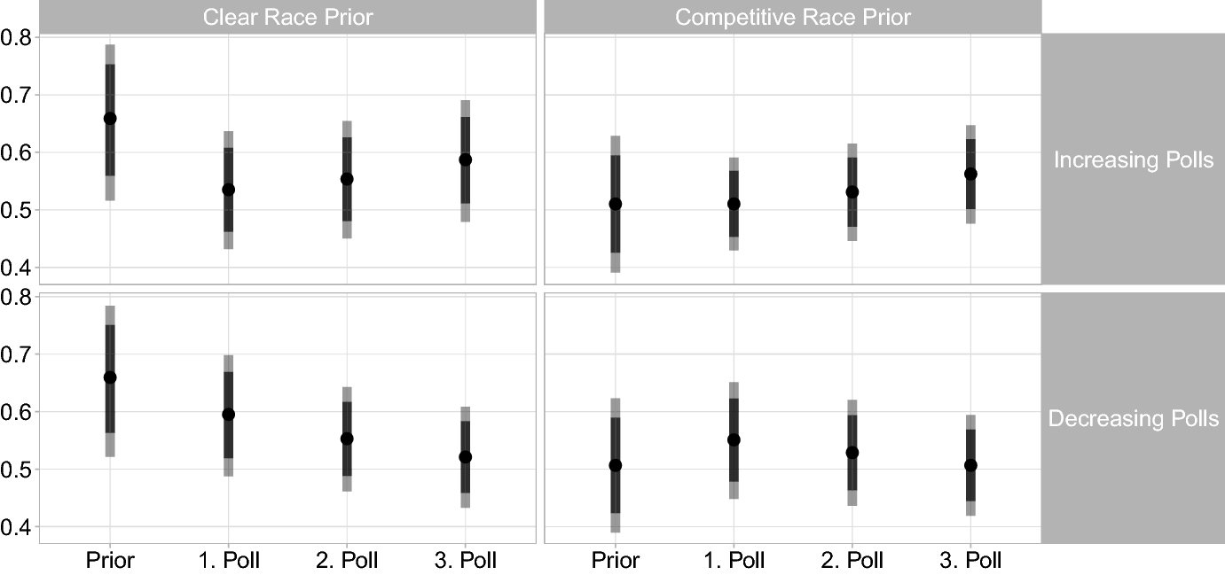 Therefore, there are four experimental groups: (a) clear race prior and increasing polls; (b) clear race and decreasing polls; (c) close race and increasing polls; (d) close race and decreasing polls. Thus, some respondents receive the first polling information that aligns with their priors while others receive information that misaligns with their priors.