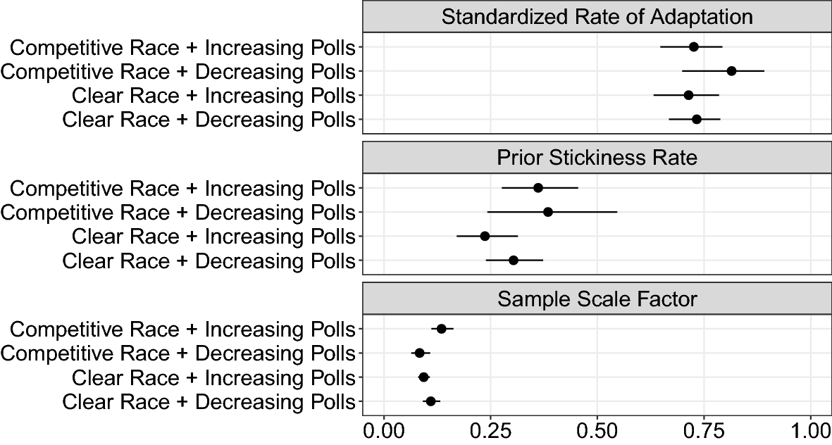 The prior stickiness rate and the sample scaling parameter are of particular interest in understanding the origin of the learning rate. The prior stickiness rate varies around 0.30 in all four scenarios. A prior stickiness rate of 0.30 implies that respondents consider the information from a new poll, but at the same time factor in their prior beliefs. We, hence, find that participants consider their priors when updating their beliefs. With this in mind, it takes some time for the effect of priors to vanish from the belief formation about the race, which can result in the described patterns above.
