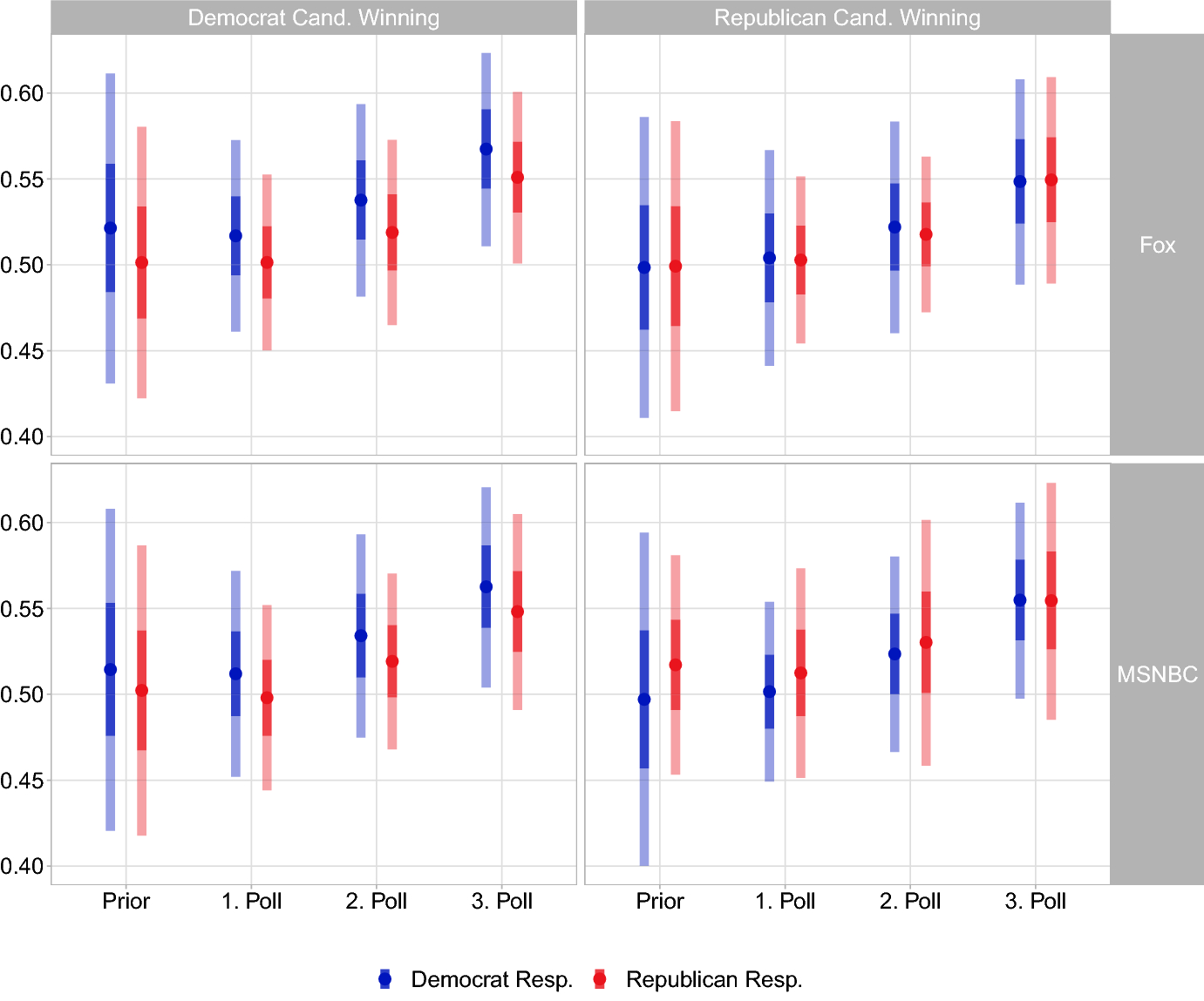 In the second experiment, we investigate if the learning process differs based on partisan motives and can result in diverging partisan beliefs about the political campaign. In this experiment, we manipulate the source (MSNBC vs. Fox) and the winning candidate of the sequence of the polls (Democratic or Republican). The results confirm the motivated processing of polling information, which is mainly due to stronger ‘stickiness’ of prior beliefs. We find that Democrats are particularly responsive to new information when they see their candidate winning, while in situations where their candidate is losing they are more reluctant. The results further indicate that this is not because they judge the results of favorable polls to be more precise, but rather because they are more likely to deviate from their prior beliefs. In line with prior findings, for example Kuru et al. (2017), we do not find clear source effects. This indicates that motivated learning in the context of polls seems to work through quick updating and not necessarily by discrediting the precision of the poll results due to the source.