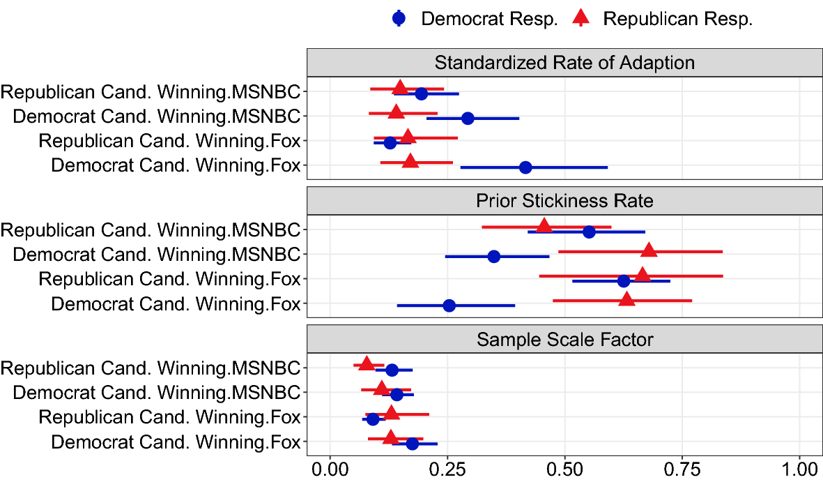 We analyze the differences in learning from polls between Democrat and Republican respondents in more detail using the parameters of the learning model.20 The top panel of Fig. 6 presents the estimates for the standardized rate of adaptation. We find that Democrats adopt stronger to poll results when the democratic candidate’s support is increasing. This is particularly true when the results come from Fox news. Here the standardized rate of adaptation raises from 0.13 to 0.41 for Democrats. Put differently, when the Democratic candidate is winning, a Democratic respondent weighs respondents in the Fox survey around three times more than when the Democratic candidate is losing. In the case of a poll from a MSNBC source, the increase in the standardized adaptation rate, from 0.19 to 0.29, is more subtle. The different scenarios do not affect Republican respondents’ standardized rate of adaptation, which estimate consistently around 0.15.