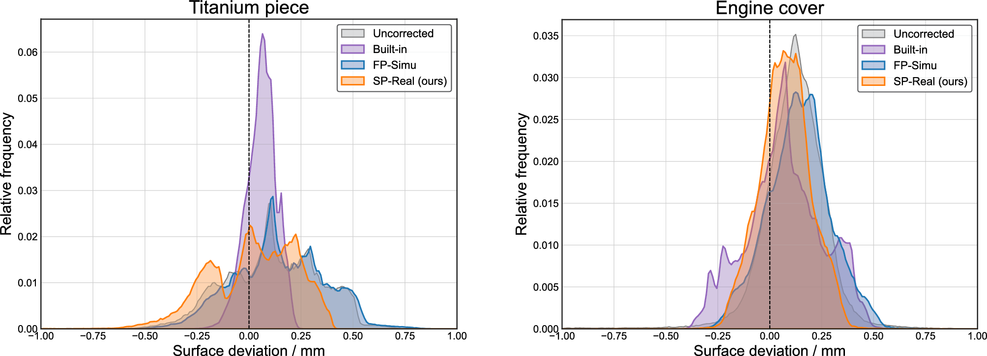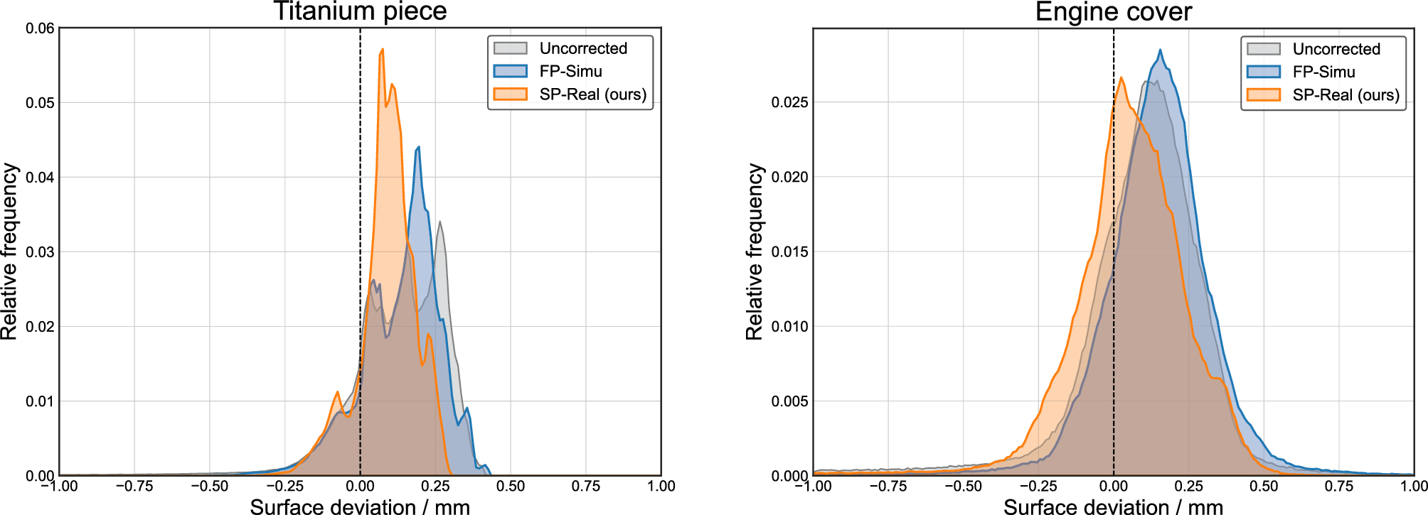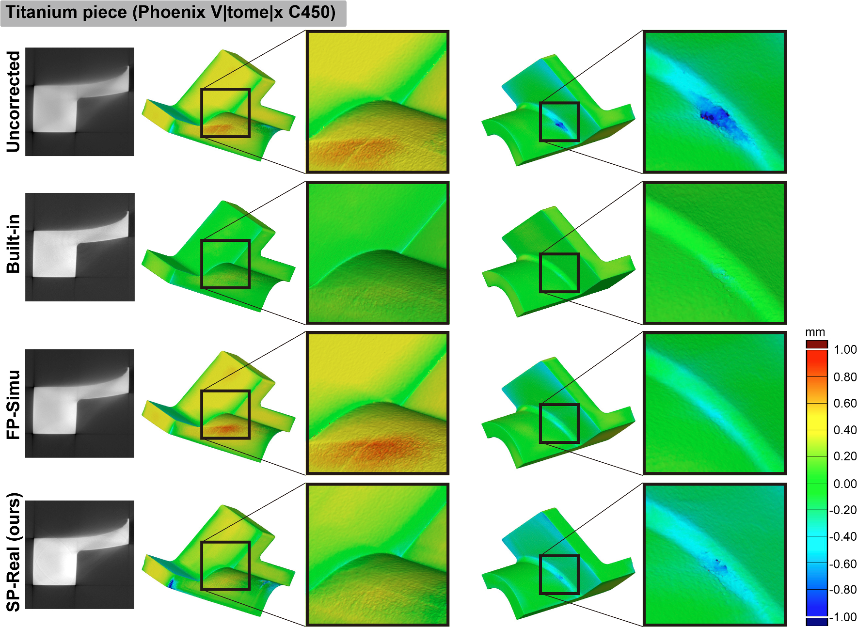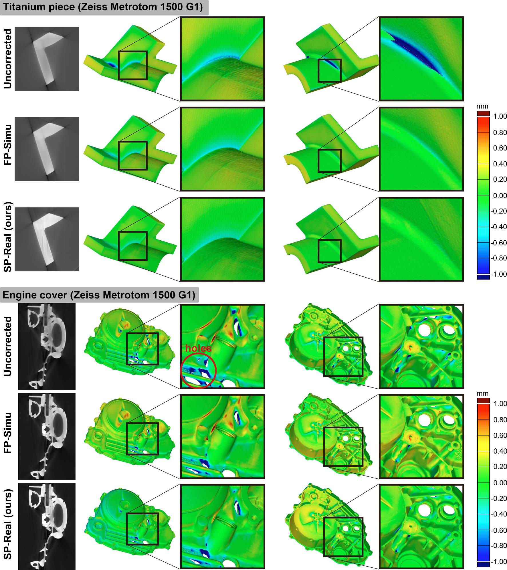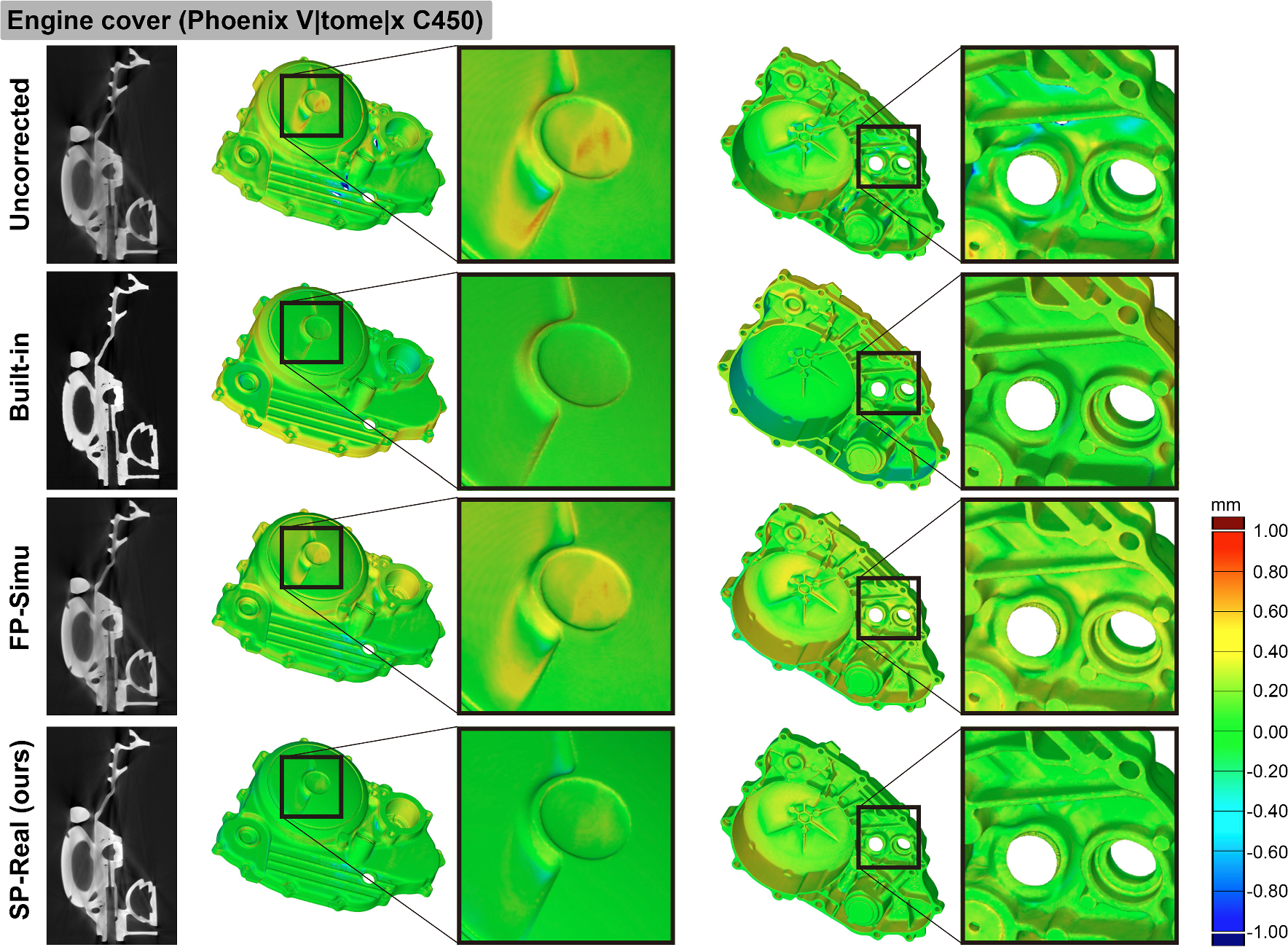 Furthermore, when using all the four test samples to compose the training data, the surface deviation for Cylinder head could be corrected the best. However, the improvement over the results trained using the engine cover and shisa figurine data is insignificant. This means that the use of a set of projections obtained for a single object is practically sufficient when the object for that is carefully chose such that the projection data contains strong scatter components.