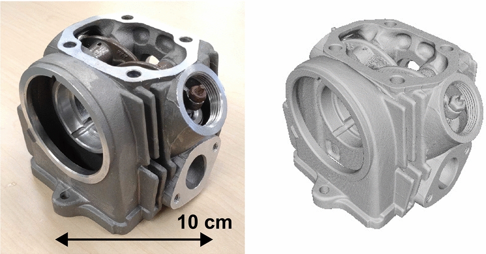 The choice of training data is an important factor to determine the quality of our deep-learning-based scatter correction method, while we trained the CNN using data obtained for shisa figurine in the previous experiments. To investigate the effect of training data for the quality of output geometries, we conducted cross validation using four experimental samples shown in Fig. 5. We also tested the importance of the variety of sample shapes in the training dataset, where the data from all four test samples were used for training and its quality is tested with another test sample, “Cylinder head,” which is made of titanium and iron. The picture and the surface mesh of the sample are shown in Fig. 14. In the same manner for the other test samples, the surface geometry obtained with scatter-corrected CT image was compared with the surface mesh captured with an commercial optical scatter.