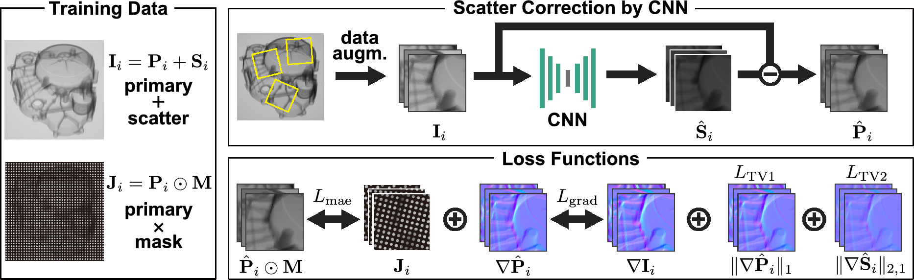 Loss for reproduction. To ensure the CNN accurately predict the scatter component \(\textbf{S}_i\) at unshadowed pixels, we use a simple mean absolute error (MAE) between \(\textbf{J}_i\) and \(\hat{\textbf{P}}_i \odot \textbf{M}\). When calculating \(\hat{\textbf{P}}\) using Eq. 1a, several pixels may exhibit negative values when corresponding entries of \(\hat{\textbf{S}}_i\) is larger than those of \(\textbf{I}_i\). Such negative pixel values of \(\hat{\textbf{P}}_i\) may cause inappropriate CT reconstruction and, as such, should be prevented. To this end, we penalize the negative element of \(\hat{\textbf{P}}_i\) by modifying the MAE. Then, \(L_{\textrm{mae}}\) is defined as