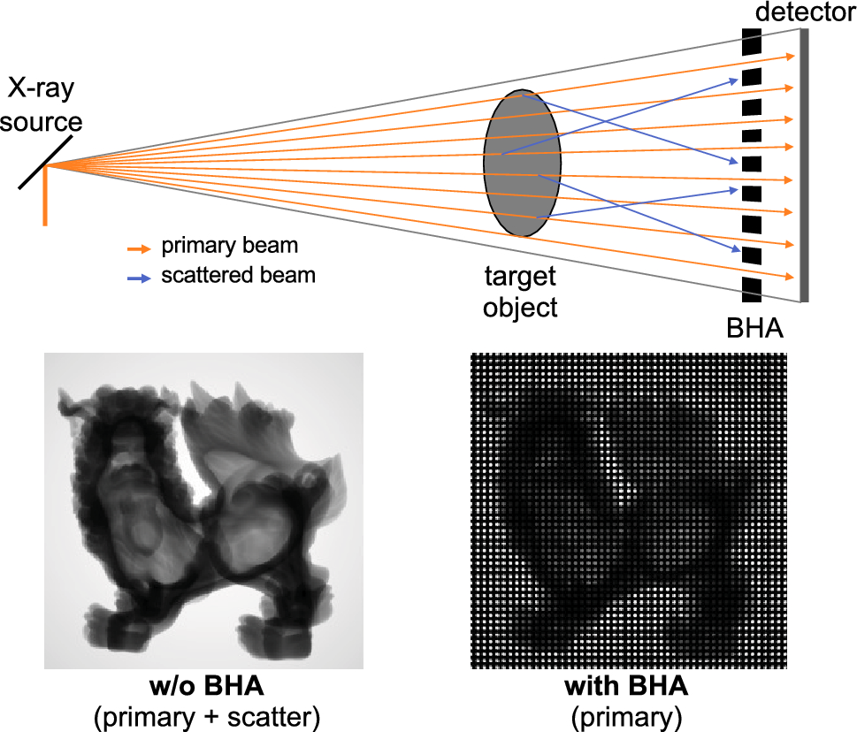 BSA and BHA are complementary hardware components. The BSA, composed of a set of cylindrical solid metal components, serves to extract scattered X-rays, whereas the BHA, a metal plate drilled by a set of cylindrical holes, serves to extract primary X-rays, namely, the X-rays entering from the primary beam line. The drawback of these arrays is that the scattered or primary X-rays are detected only by a part of the detector pixels. Therefore, the software process is required to interpolate pixel values. Since another set of projections consisting of both scattered and primary X-rays are used as a guide for the interpolation, we need to take two series of projections using and not using the array to obtain a scatter-free CT image. Furthermore, while BSA and BHA are effective hardware for scatter correction, devices equipped with such hardware are not yet widely available.