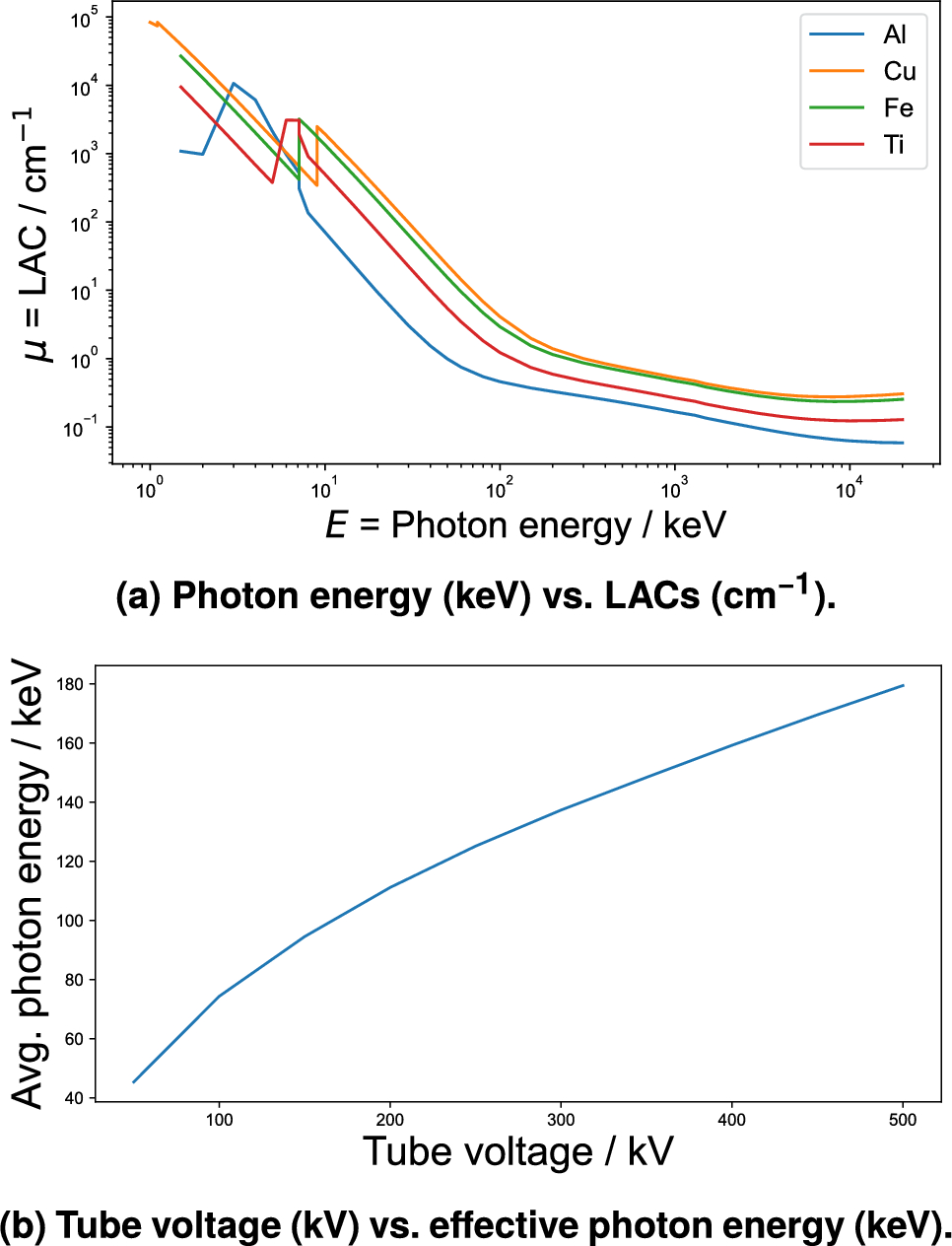 a A double logarithmic chart illustrating the variation of LAC as a function of photon energy. b A plot showing the correlation between tube voltage and the effective photon energy of an X-ray computed specifically for a tungsten target