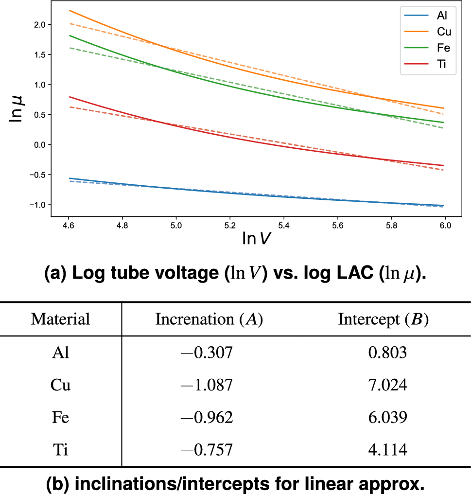 Figure 3a is a double logarithmic chart of the change in LAC \(\mu \) against the photon energy E. In contrast, Fig. 3b is another chart of the change in the effective photon energy \(\bar{E}\) against tube voltage V, specifically computed for a tungsten target. These charts are computed using aRTist, X-ray CT simulation software. From these two charts, we calculated the relationship between tube voltage and LACs of typical metals: Al, Cu, Fe, and Ti. Figure 4 shows the linearity between the logarithmic tube voltage \(\ln V\) and the logarithmic LAC \(\ln \mu \). The domain of the tube voltage in this chart is narrowed to the typical one in industrial X-ray CT devices (i.e., from \(100\, \hbox {kV}\) to \({400}\,\hbox {kV}\)). We write the linear relationship between \(\ln V\) and \(\ln \mu \) as
