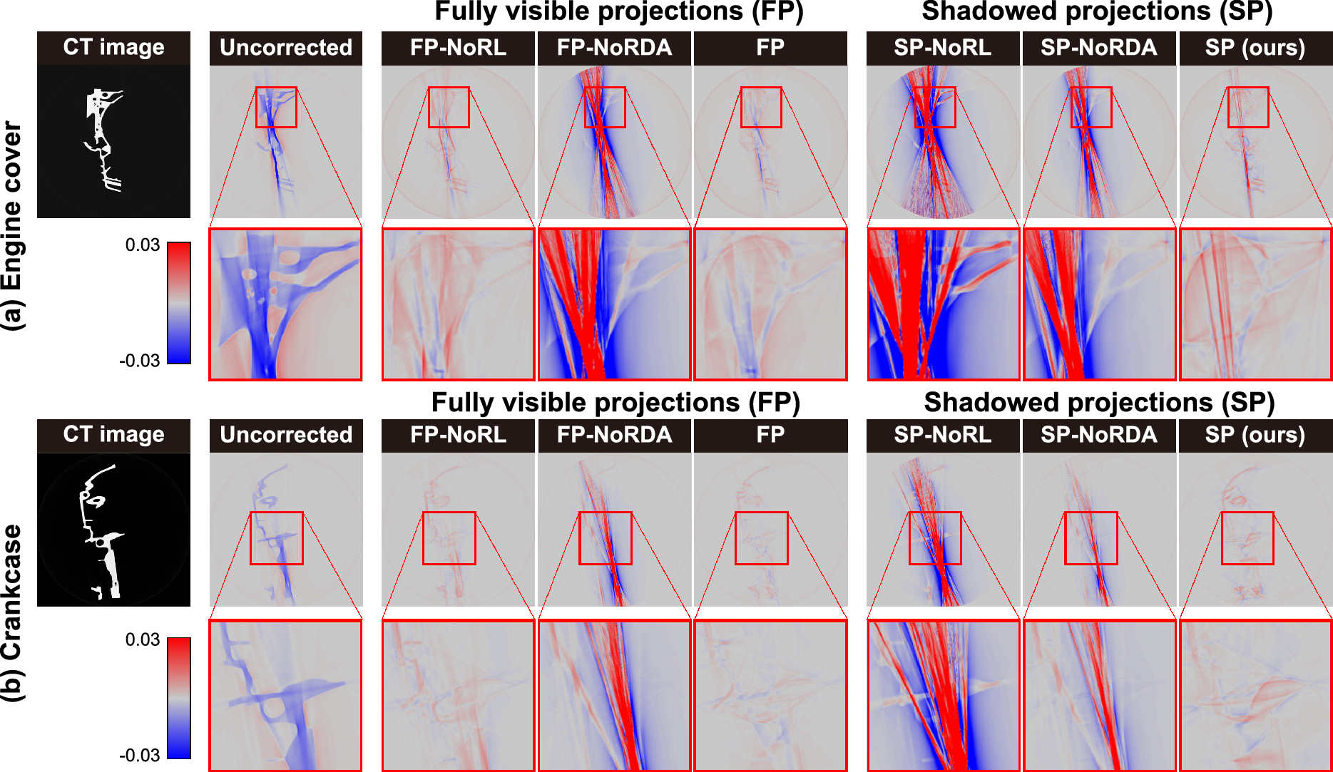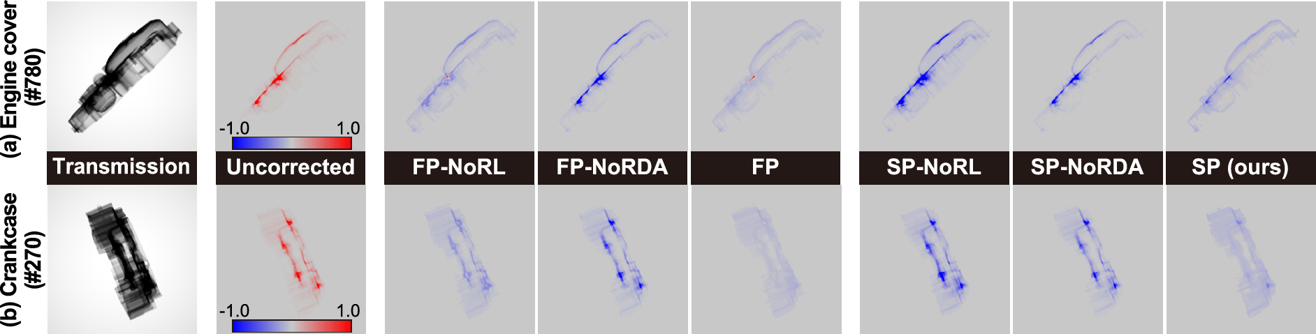 Table 9 gives us several insights on the training datasets. As we mentioned previously, the choice of the shisa figurine as the default training data is the best choice among the four. The engine cover can also be a good choice because it is composed of two materials, i.e., aluminum and iron, and offers the projection data containing more scatter components. In contrast of these two, the crankcase is made of aluminum, which is comparatively a light metal, and the titanium piece has a simple shape while titanium is comparatively a heavy metal. Because of the lightness of the material and the simplicity of the shape, the projection data obtained for these samples can be less challenging. Accordingly, the scatter correction qualities are significantly worse than those of the engine cover and shisa figurine.