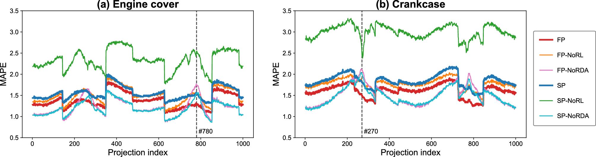 Bolded values indicate MAPEs for the method using fully visible projections (FP) and the other using shadowed projections (SP) using both the regularization losses (RL) and radiographic data augmentation (RDA). Other values in a regular font represent those without RL (-NoRL) or RDA (-NoRDA). Parenthetical values represent the percentage difference between FP and SP using and not using the RL and RDA