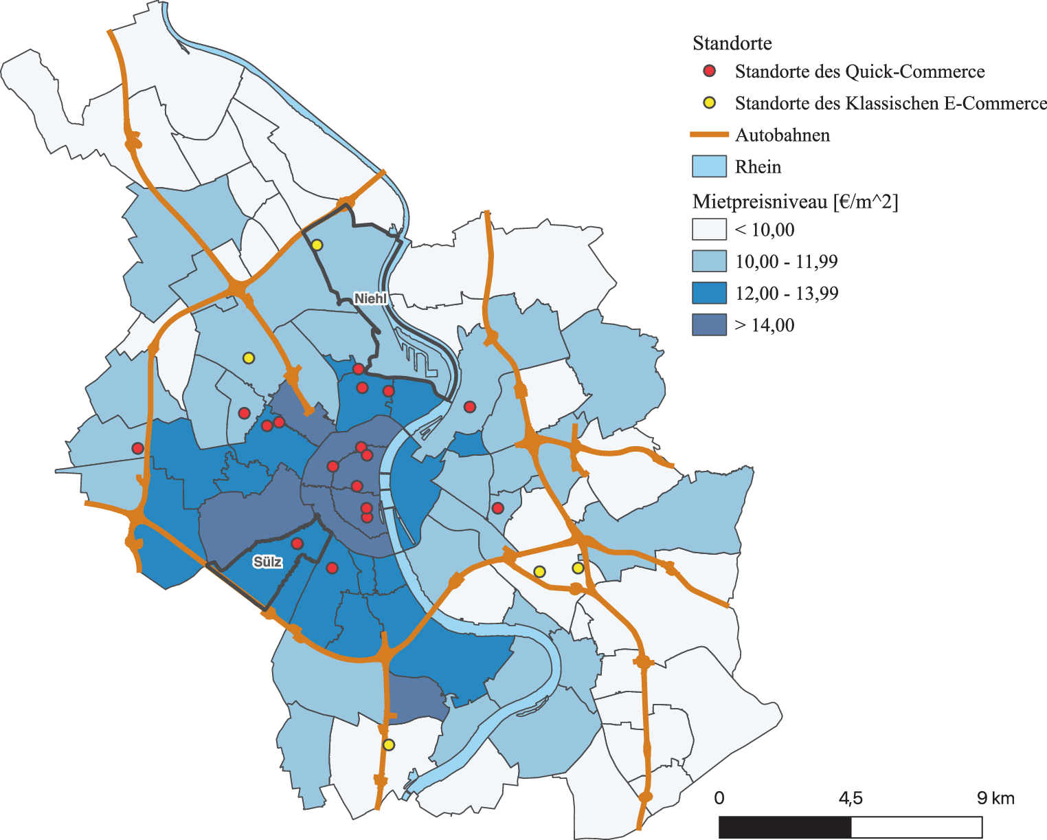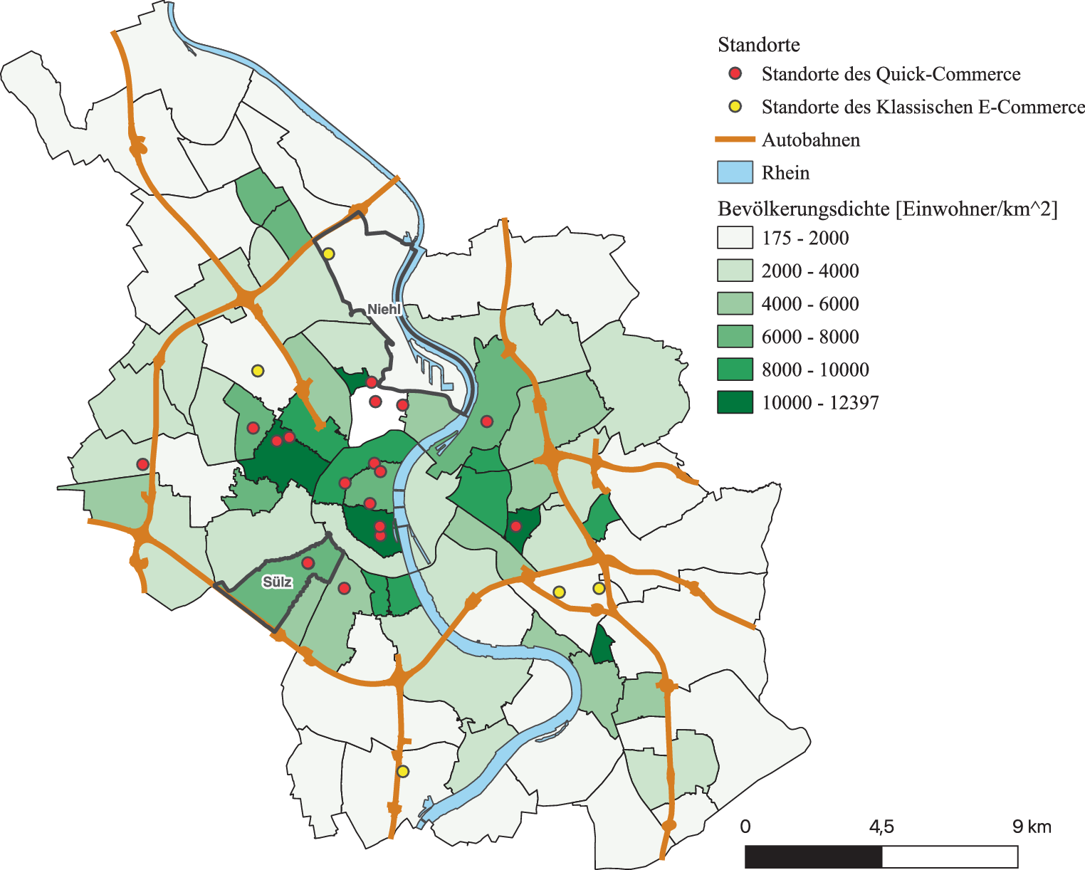 Die Unternehmen des Q‑Commerce lagern den Warenbestand in mehreren kleinflächigen Micro Hubs, die über das Stadtgebiet verteilt sind. Beispielsweise hat die Flink GmbH sieben Logistikstandorte im Raum Köln, darunter einen Standort im Stadtteil Sülz, einem der Kölner Stadtteile mit der höchsten Bevölkerungsdichte. Die Bevölkerungsstruktur ist durch eine überdurchschnittliche Anzahl an 18- bis 34-jährigen Menschen, eine hohe Haushaltsdichte sowie eine geringe Arbeitslosenquote gekennzeichnet. Die Umgebung des Standortes, welche im Flächennutzungsplan der Stadt Köln als Wohngebiet geführt wird, ist geprägt durch Mehrfamilienhäuser, kleine Restaurants und Cafés. Das bevorzugte Auslieferungsmittel am Standort sind E‑Bikes, die zu den Öffnungszeiten auch vor dem Lokal auf den Gehwegen abgestellt werden. Das Liefergebiet des Micro-Hubs umfasst auf einer Fläche von 19,73 km2 die Stadtteile Zollstock, Klettenberg, Sülz und Lindenthal. Um ein größeres Stadtgebiet abzudecken, besitzt die Flink GmbH weitere sechs Standorte in anderen Stadtteilen, die sich ebenso durch eine hohe Bevölkerungsdichte kennzeichnen. Das gesamte Liefergebiet von Flink nimmt ungefähr ein Viertel des Kölner Stadtgebiets ein und deckt mit rund 530.000 Personen die Hälfte der Kölner Bevölkerung ab. Die Distanz zu dem nächstgelegenen Autobahnanschluss beträgt bei Unternehmen des Q‑Commerce im Schnitt 2,148 km. Vom Standort in Köln-Sülz beträgt die Distanz zur Autobahnauffahrt im Stadtteil Klettenberg sogar fünf Kilometer. Das Mietpreisniveau liegt an diesem Logistikstandort mit 13,00–13,99 €/m2 im vergleichsweise hohen Bereich. Die ebenfalls in Köln ausliefernden Unternehmen des Q‑Commerce, Getir, Gorillas und Getfaster zeigen vergleichbare Standortmerkmale. Alle Standorte des Q‑Commerce können in Stadtteilen mit einer überdurchschnittlichen Bevölkerungsdichte verortet werden. Im Schnitt beträgt die Einwohnerdichte in den Liefergebieten des Q‑Commerce 8315 Einwohner*innen/km2 und liegt damit deutlich über der Bevölkerungsdichte des gesamten Kölner Stadtgebiets (2697 Einwohner*innen/km2). Dies bedingt höhere Mietkosten sowie eine geringere Flächenverfügbarkeit. Die Analyse der Standorte zeigt, dass die vier Unternehmen des klassischen E‑Commerce im gesamten Stadtgebiet konkurrieren, während die Unternehmen des Q‑Commerce nur 37 der 86 Kölner Stadtteile abdecken und nur in sechs Stadtteilen Kölns alle vier Unternehmen den Lieferdienst anbieten.
