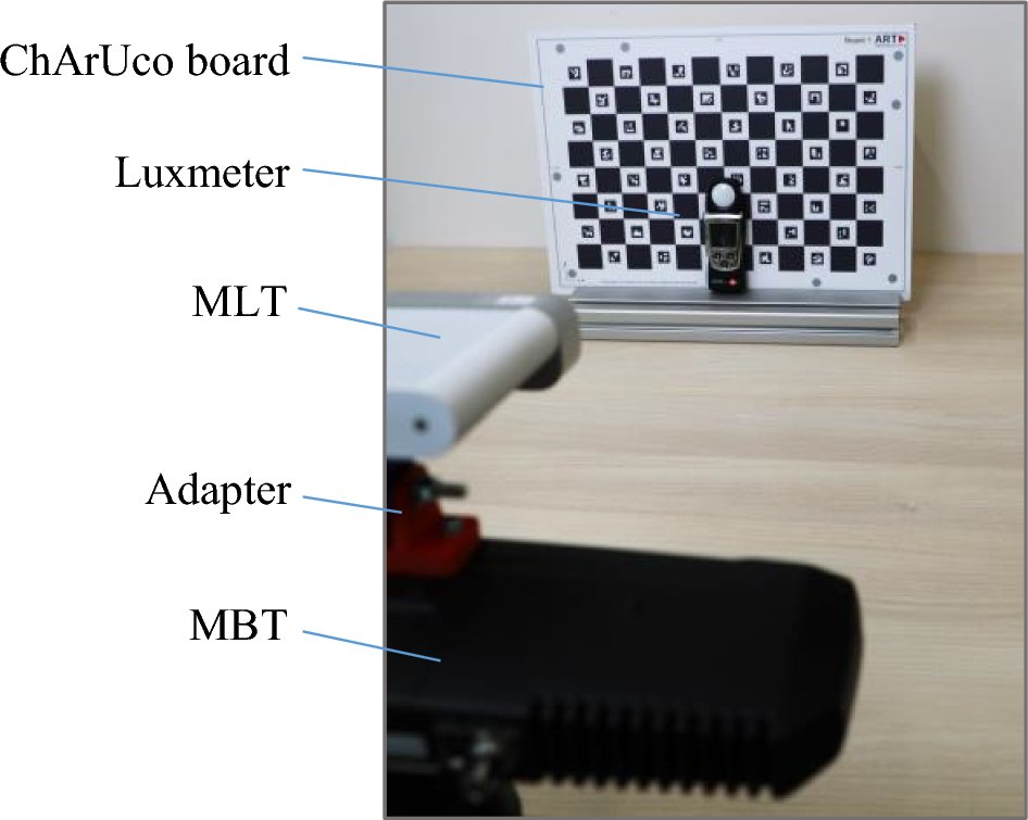 During measurements the environment always has to be considered. The speed of light is depending on temperature, humidity and pressure. Thus pose determination of MBT and MLT are influenced, because they are based on infrared light or visible light. But the impact, at distances of less than \(5\,\textrm{m}\) considered here, is negligible. Direct sunlight on the measuring systems should be avoided and the room temperature should also remain stable. For MBT, sunlight coming from a window can lead to interference signals or unwanted reflections from the background. For MLT, work area illumination and background colour contrast influence component detection and tracking significantly. When having too low illuminaton or too cluttered background, component contours or features might not be recognised properly by computer vision algorithms.