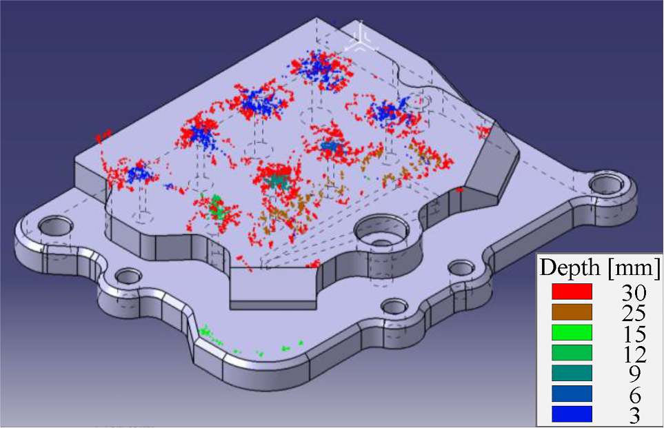 During inspection, the position of the IT is saved as a point cloud. Corresponding ultrasonic data is converted to a remaining component thickness, which is used to colour the point cloud according to the measured depth afterwards. All points that are not colored red can be assigned to either a drill hole or a pocket. The required speed of sound (\(6250\,\mathrm {m/s}\)) is calculated beforehand by using the ultrasonic measured ToF and the physically measured component thickness. Without any postprocessing or data transformation, the recorded inspection data (in the format of xyzrgb) can be imported to a CAD software to superimpose it to the corresponding CAD model, see the visualisation in Fig. 13.
