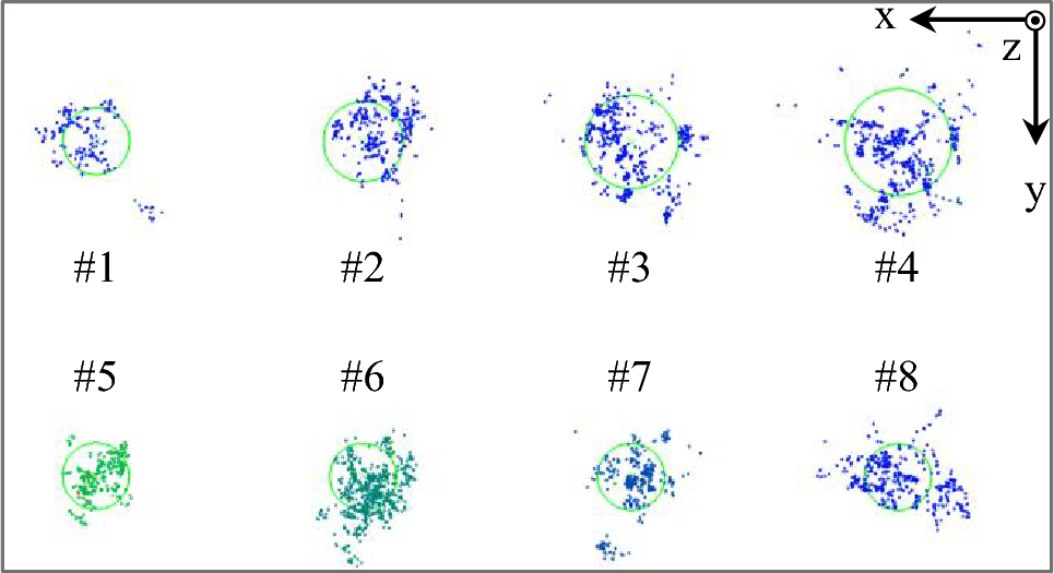 In Table 5, the information on the percentage of outliers is given. It indicates the amount of wrong localised positions of the IT. But it must be considered, that also the points inside the green circles are subject to measurement uncertainties. However, there is no observable relationship between drill hole diameter and the amount of outliers.