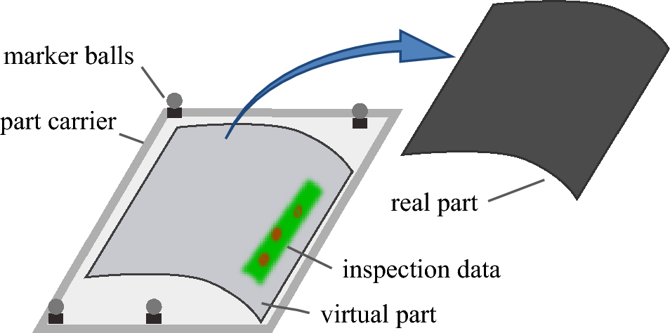 To determine the position of an inspected component, optical tracking systems can be used. A main requirement is a dynamic pose determination, so the inspected component and the inspection tool can be moved and rotated during inspection. This is important, as described in [4], because using the ability of viewing and touching the component results in the highest accuracy in determination and classification of defects. Using fiducial markers for tracking purposes of the inspected component is not always possible and furthermore this would have a serious disadvantage: If any kind of external reference aid (e.g. component carrier, tracking marker) is used, recorded inspection data is never directly related to the component, but always to the reference aid. The reference aid can be calibrated to the component, but movements of the component are only possible, if the reference aid can be moved with it. As shown in Fig. 1, the component is removed from a component carrier, but a visualisation of the data remains with its virtual component at the component carrier. As a result, markerless tracking systems are a key for the digitalisation of manual inspection processes.