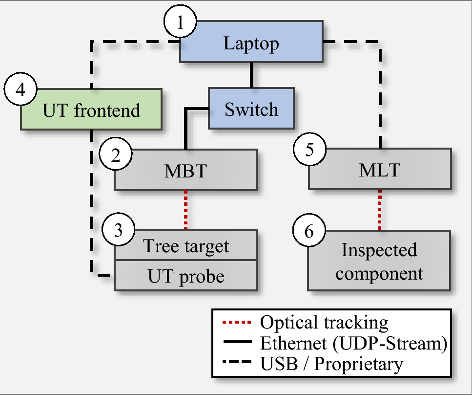 Three measuring systems are providing data, see Fig. 2. The ultrasonic device provides inspection data, especially a sample time increment, amplitude value, number of samples between first and second amplitude (Time of Flight: ToF) and sample values. The MBT system provides the pose of the TT and the MLT system provides the pose of the IC. Pose data is in form of xyz position and rotation matrix. All data of these measuring systems is transmitted via UDP signal.