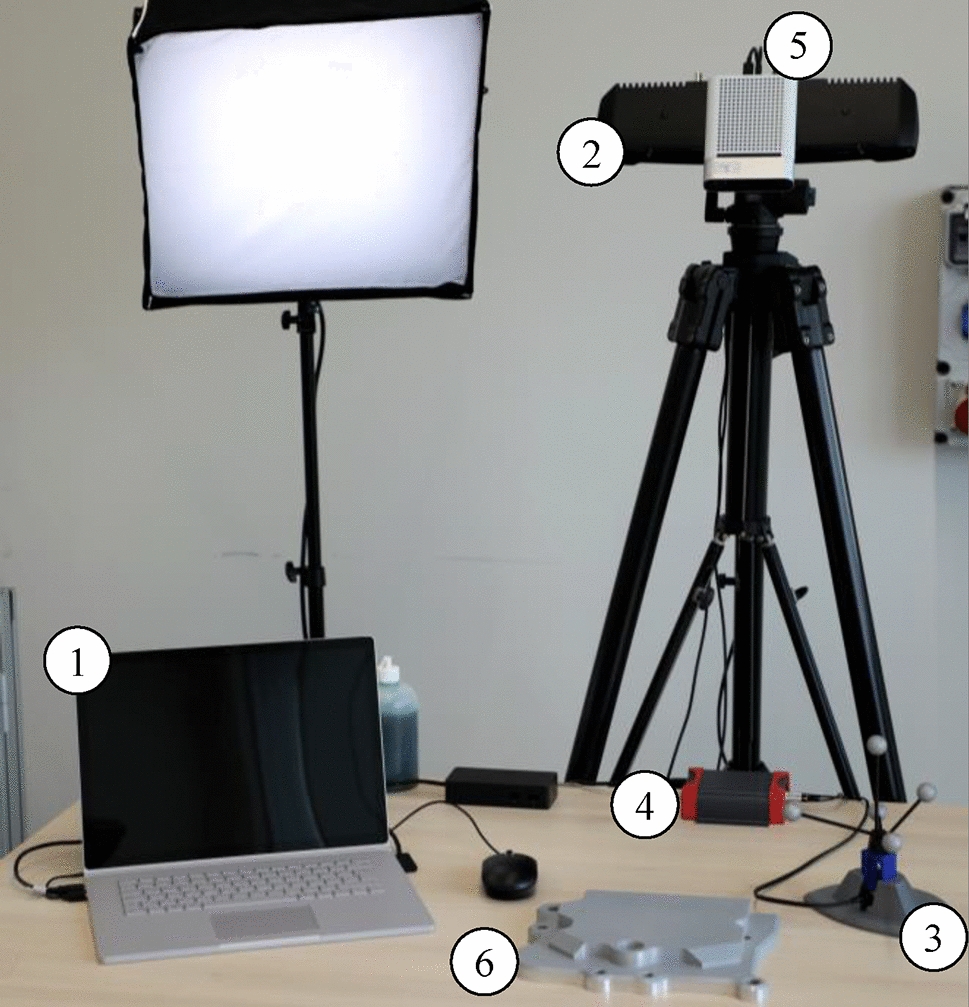 In this way, the component itself can be used as a reference system for data localisation and it is not necessary to equip the component with any fiducial markers or to use any part carrier with external references. Thus, it has a high potential to be used in manual inspection processes. Of course, it is possible to calibrate a component to a rigid workpiece holder serving as a reference aid, but this limits the free movement and rotation of the component held in the hand. In addition, the component must not move in the fixture.