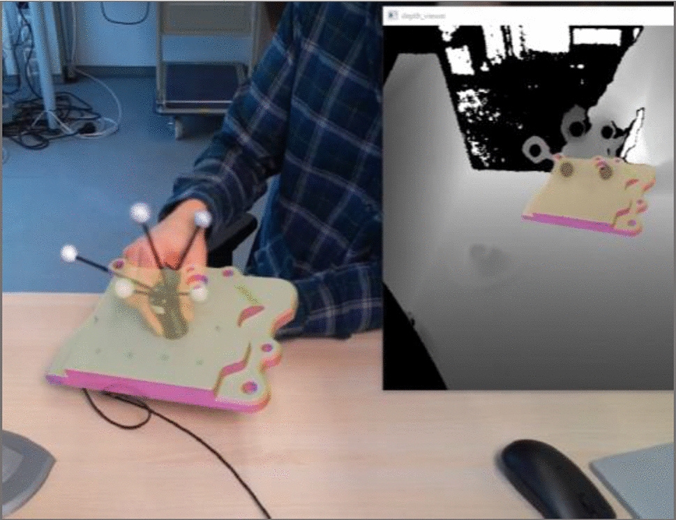 A recent publication demonstrates an ultrasonic inspection of a helicopter fuselage by tracking the ultrasonic probe with retroreflective ball markers using an infrared-based motion tracking system. During inspection, the localised ultrasonic data is used for texturing a 3D-model of the inspected component, which is visualised by a Mixed Reality device [13]. A main optimisation that is aimed at the outlook is a future auto-alignment of the virtual model to its real correspondent, which can be realised by using markerless tracking capabilities. The referenced markerless tracking system is the product CAPTA [14], which has already been researched for this task in [5]. A main conclusion was that a monocular camera for markerless tracking purposes has accuracy limitations in determining the object position in depth.
