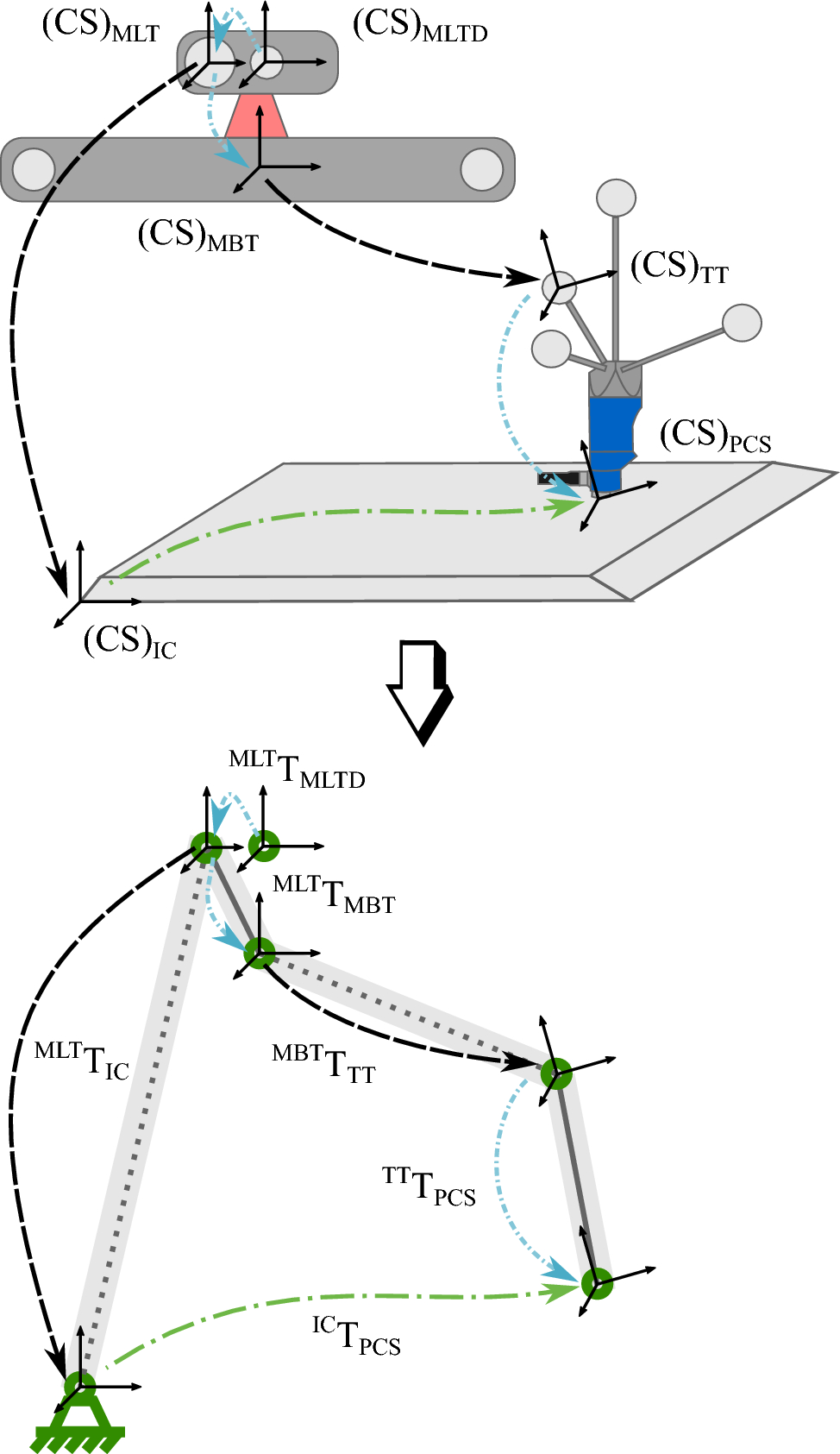 The hybrid inspection system (above) can be described as a serial-chain manipulator (below). In consequence, \((CS)_{IC}\) is defined as the base and \((CS)_{PCS}\) as the end-effector