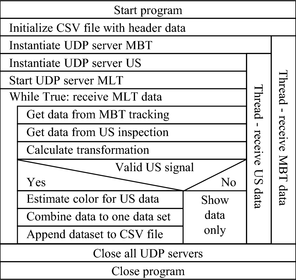 Figure 6 shows that the while loop of the MLT UDP server contains data requests to the other UDP servers. By structuring the program in the presented way, data synchronisation is realised by having the slowest part setting the measurement frequency (MLT: \(30\,\textrm{Hz}\)), while the ultrasonic frontend enables a measurement frequency up to \(2\,\textrm{kHz}\) and the markerbased tracking system up to \(150\,\textrm{Hz}\).